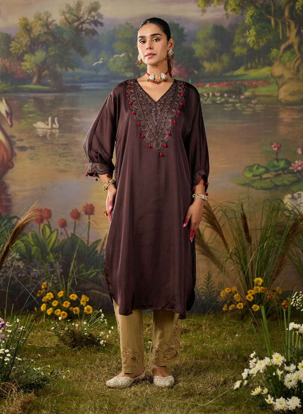 Rangrez Chocolate Brown Satin Zari Embroidered Kaftan