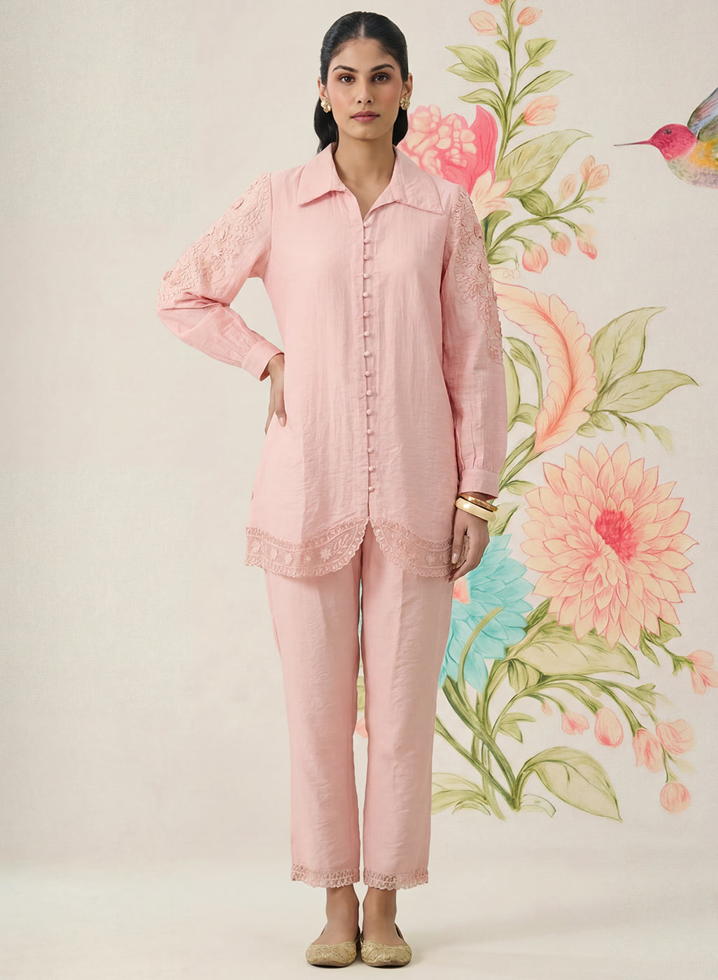 Pink Monochrome Embroidered Linen Blend Co-Ord Set