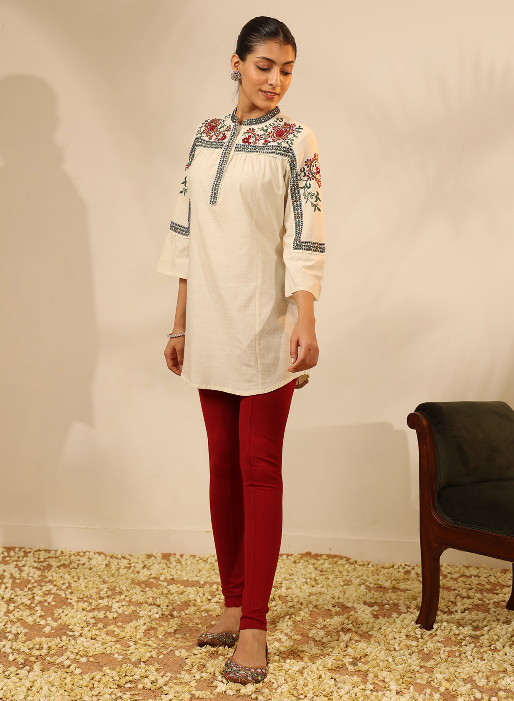 Niya Ivory Embroidered Cotton Linen Slub Long Top for Women