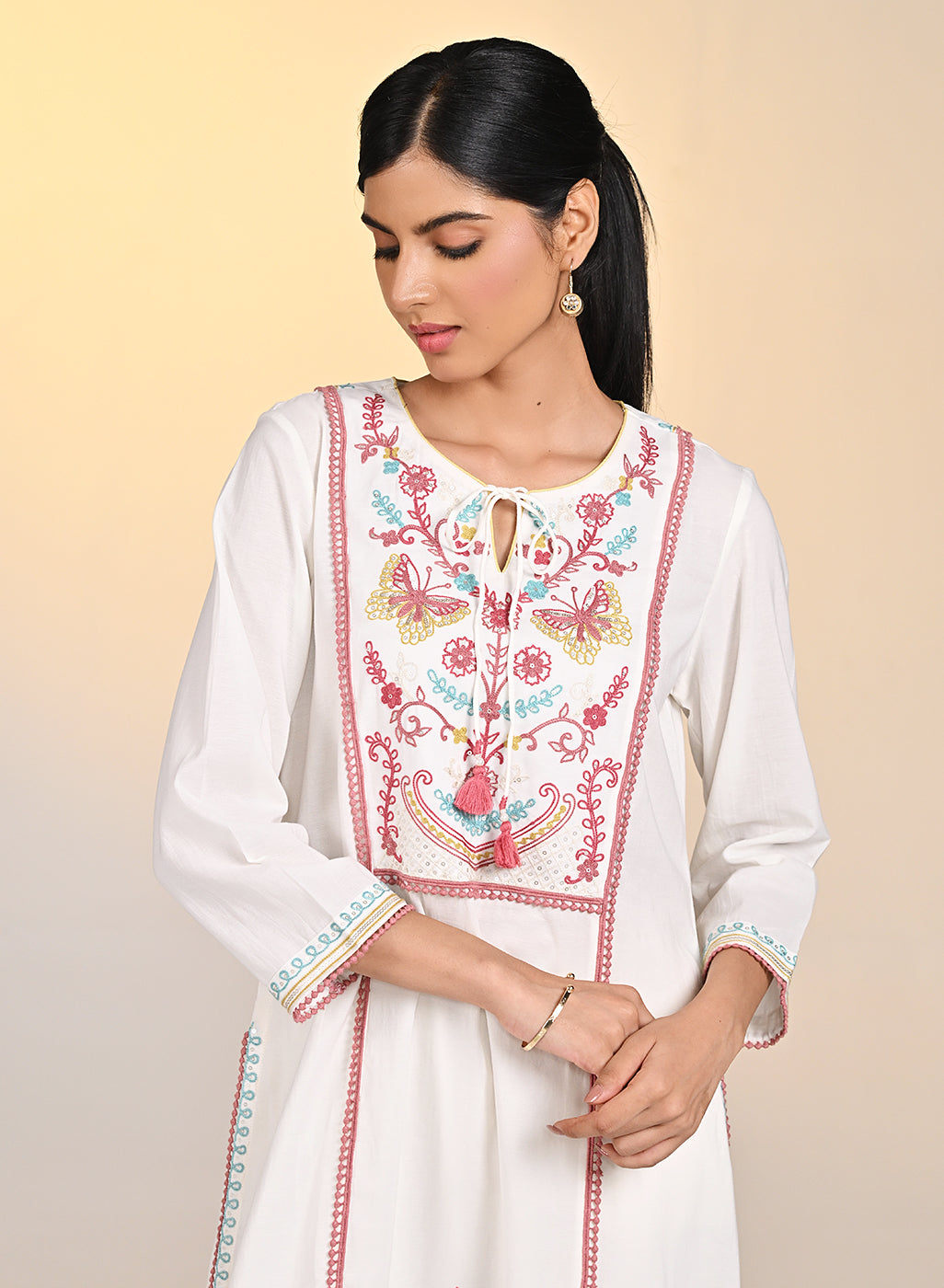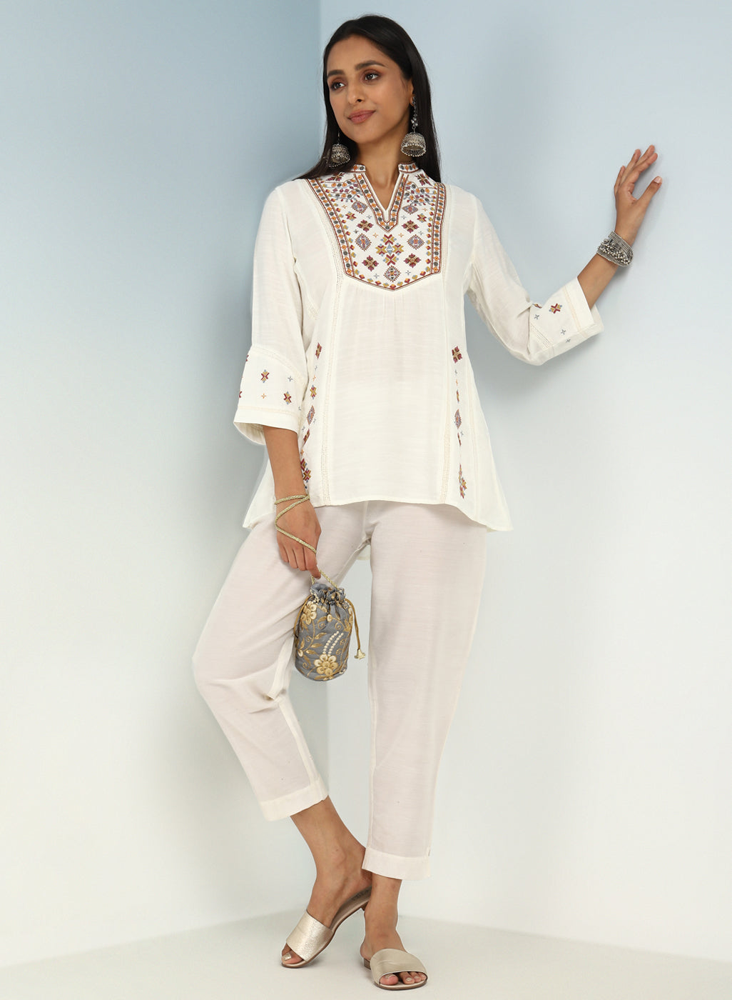 Off-white ethnic wear such as off-white kurta sets and off-white ethnic tops for women also allows for creative expression and personalization. The neutral nature of the colour enables women to accessorise and style their outfits in diverse ways. They can experiment with statement jewellery, colourful dupattas, or contrasting footwear to add their personal touch and create unique ensembles that reflect their individuality.