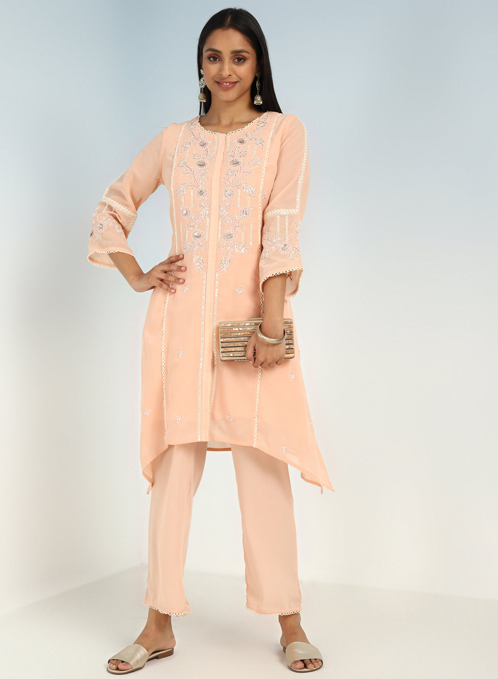 Pink Floral Printed Loose Fit Kurta with Lace Inserts