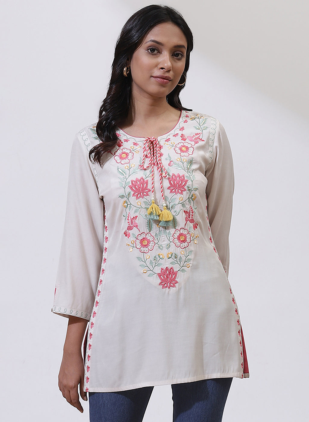 White Phool Collection Kurti With Multi-Colour Embroidery
