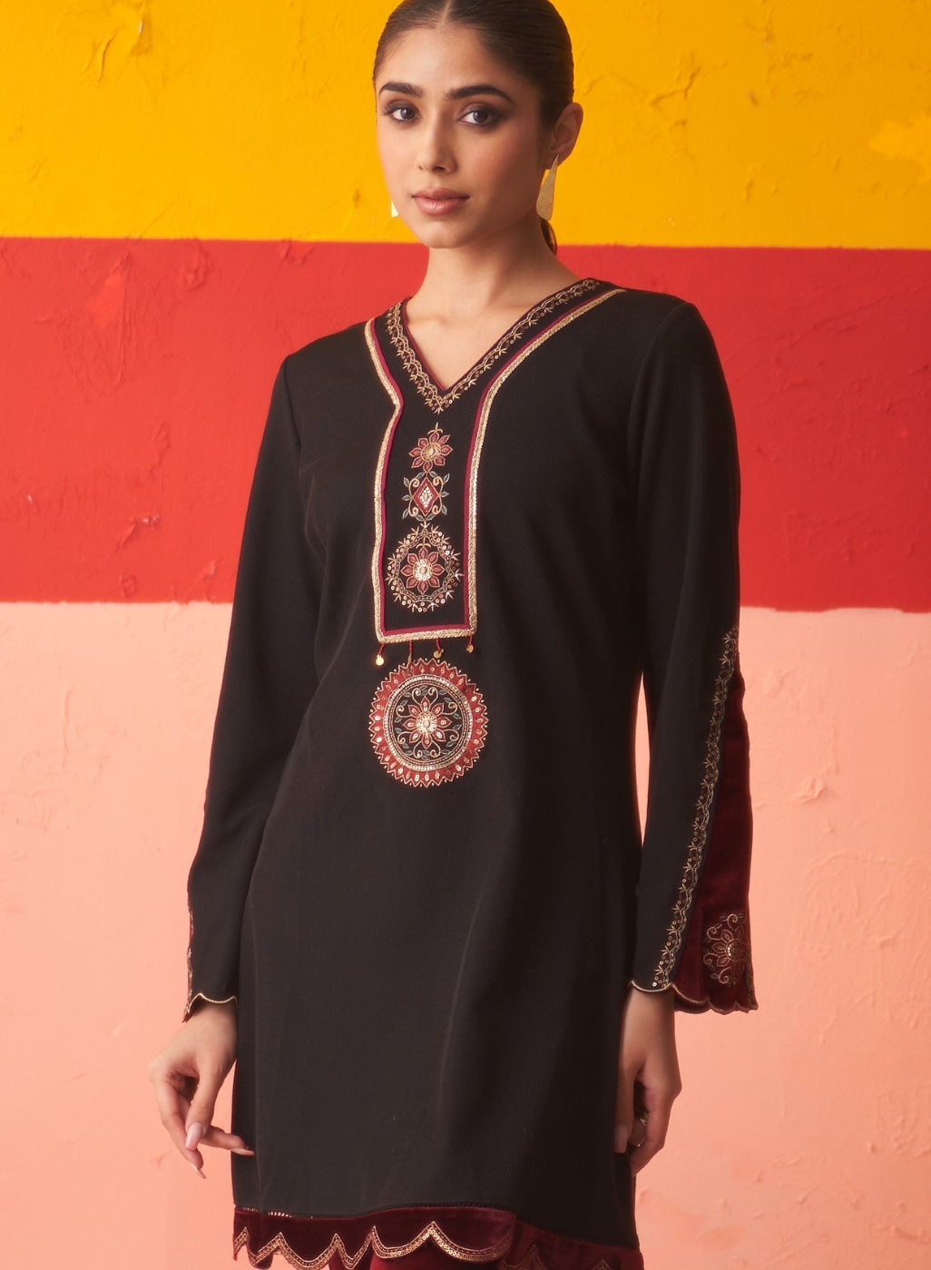 Black Woollen Kurta for Women with Leather Collar and Sequin Work