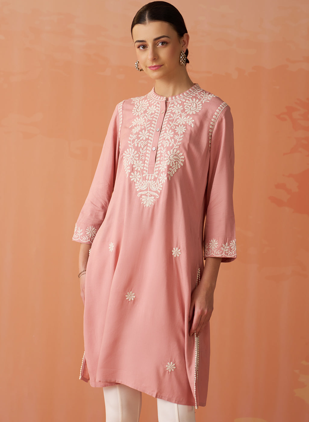 Saadgi Carnation Pink Embroidered Cotton Linen Tunic for Women