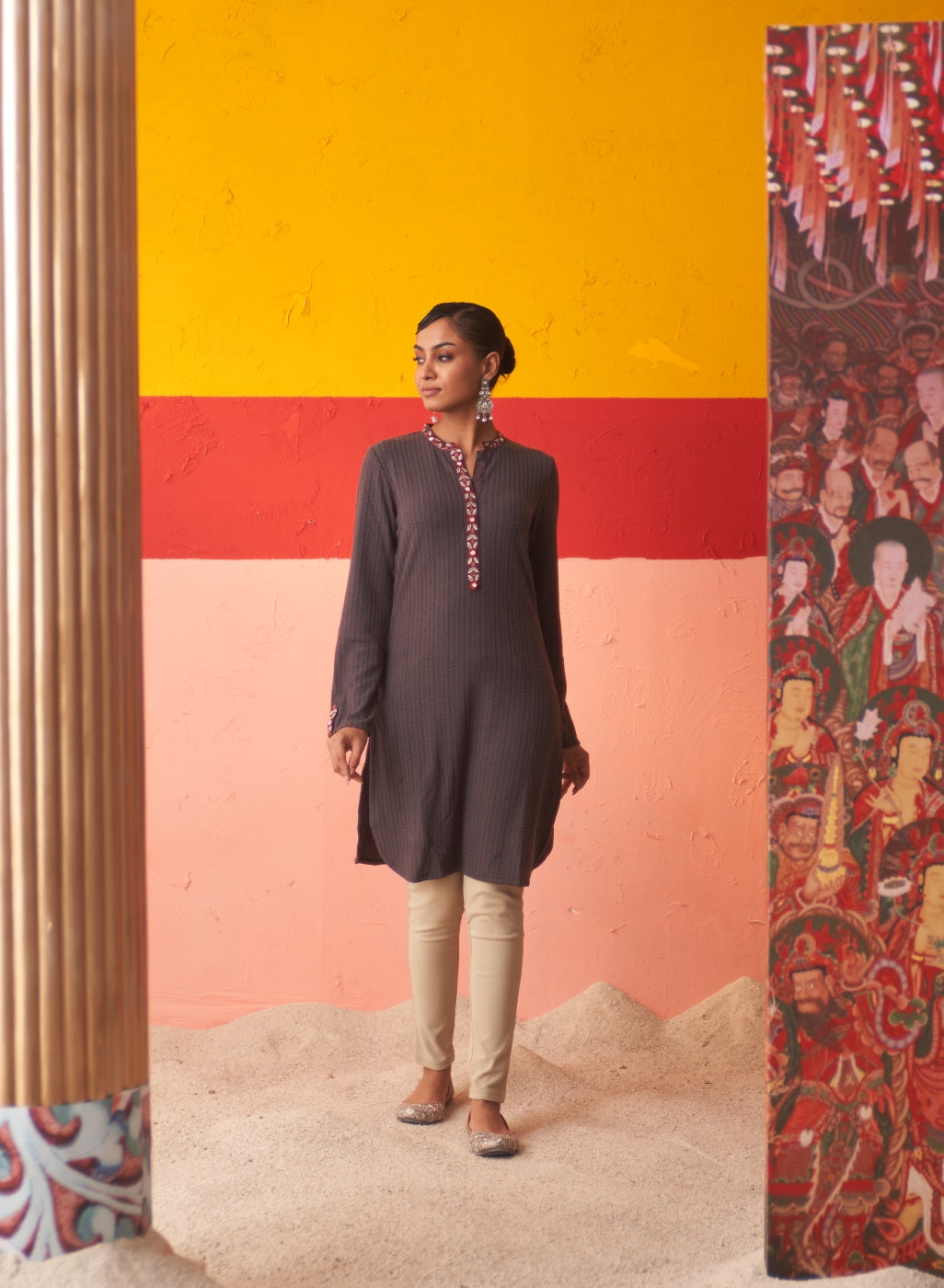 Purple Woollen Kurta for Women with Leather Collar and Sequin Work