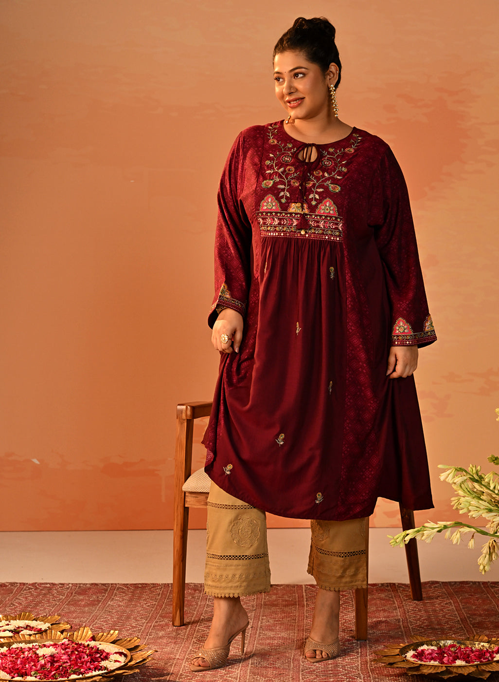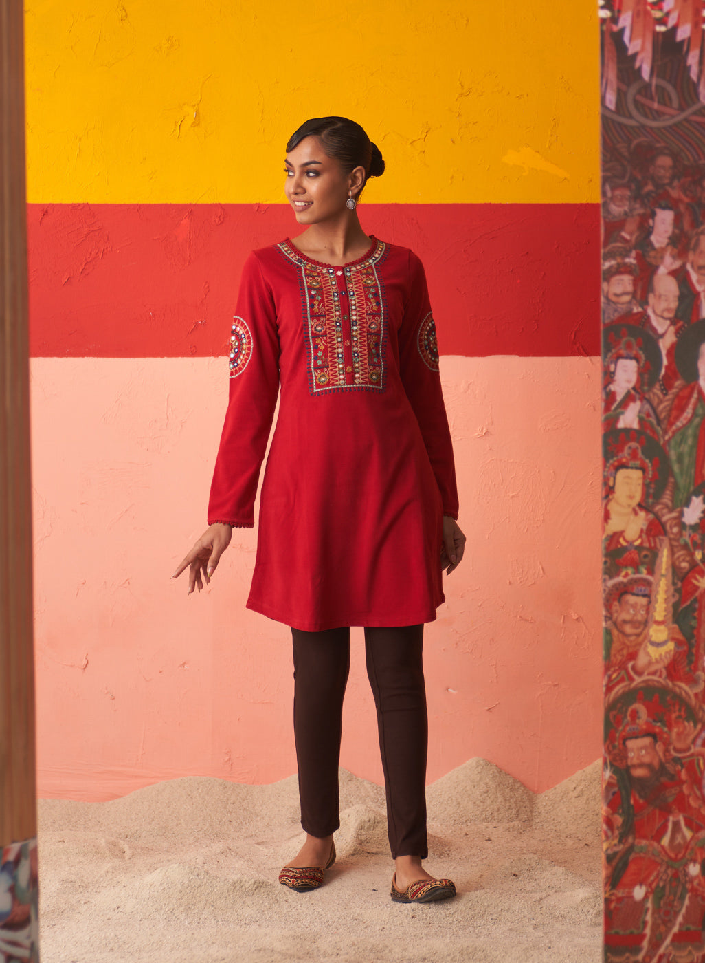 Red Embroidered Woollen Kurti for Women with Mirror Work