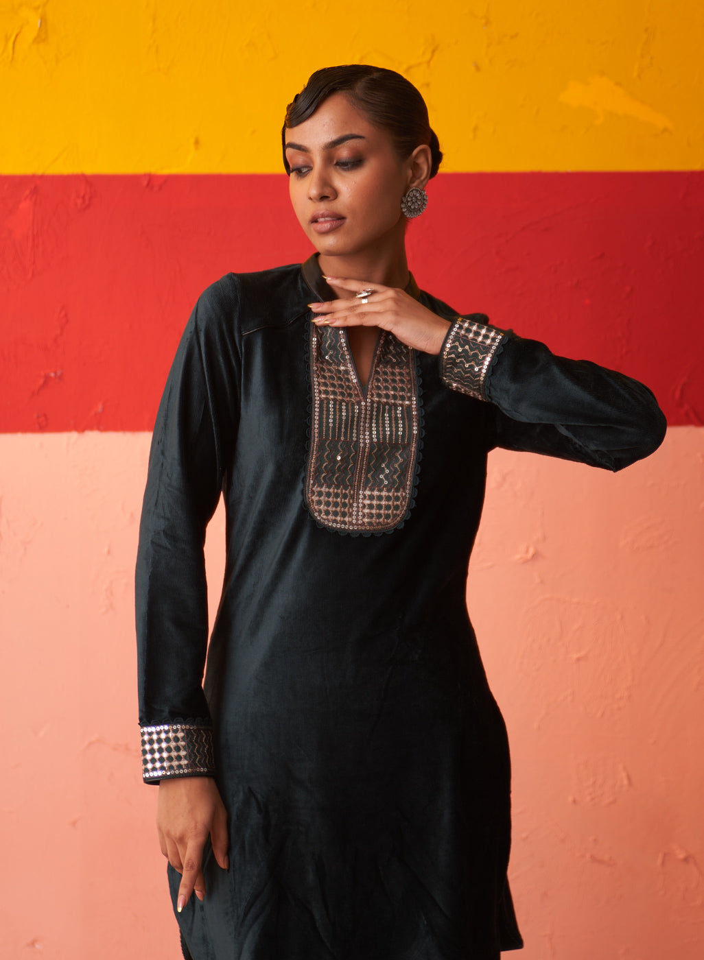 Black Woollen Kurta for Women with Leather Collar and Sequin Work