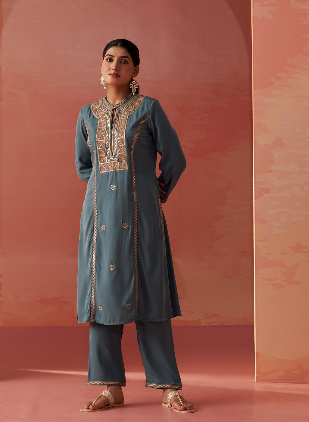 D. Navy Monochrome Embroidery Rayon Kurta Set