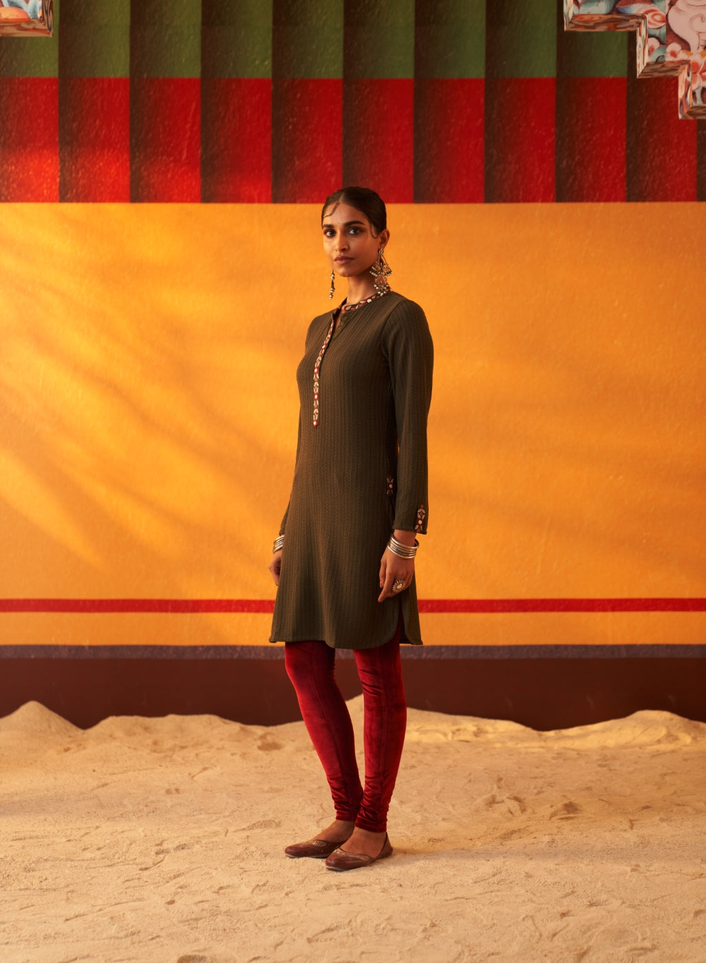 Essex Green Woollen Kurta for Women with Leather Collar and Sequin Work
