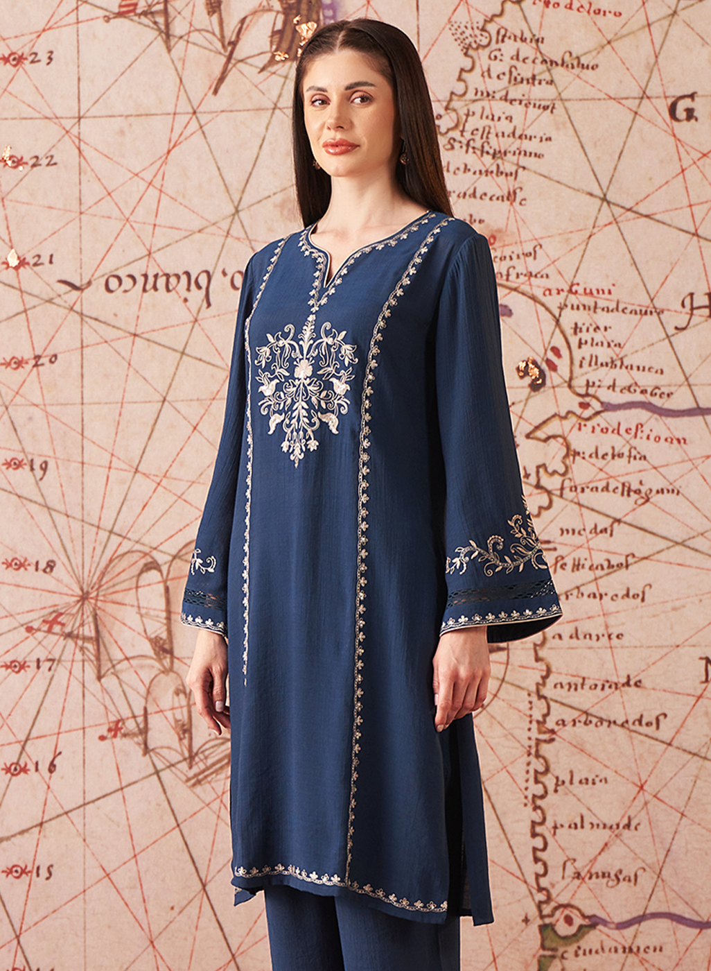 Navy Embroidered Cotton Gauze Kurta - Mid