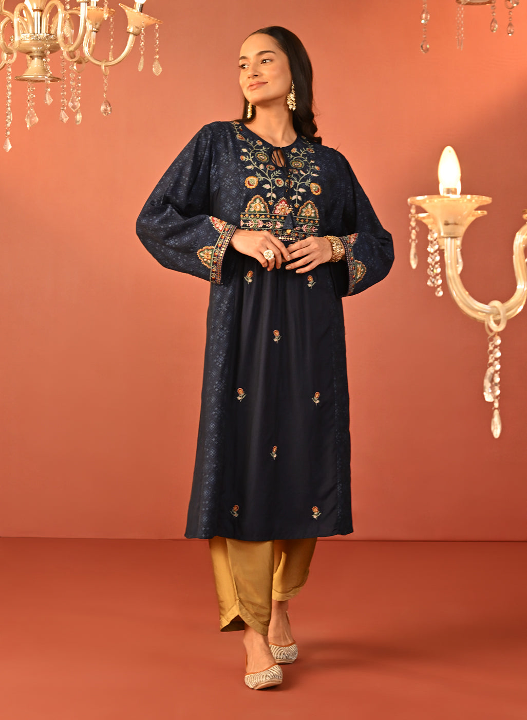 Navy Blue Embroidered Woollen Kurti for Women with Mirror Work