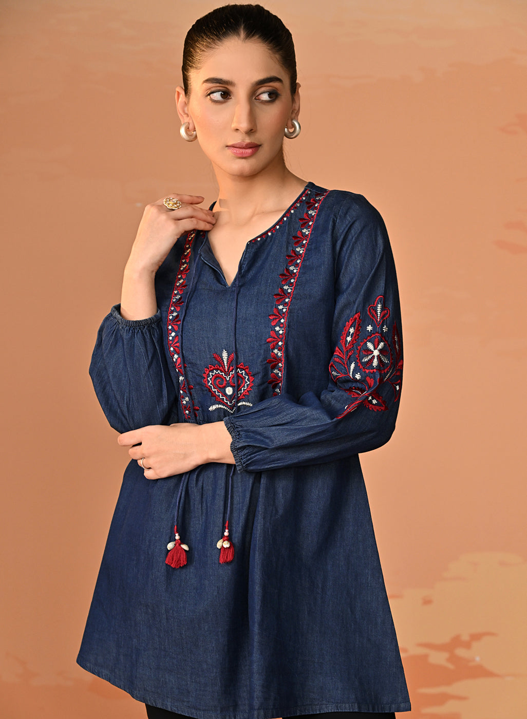Saadgi Windy Blue Embroidered Cotton Linen Tunic for Women