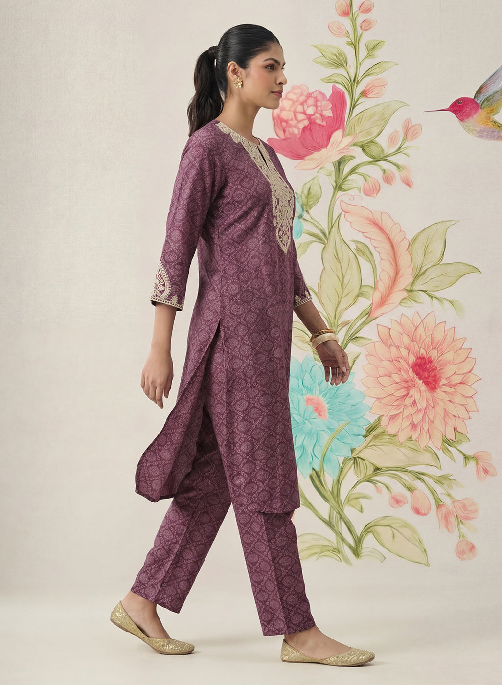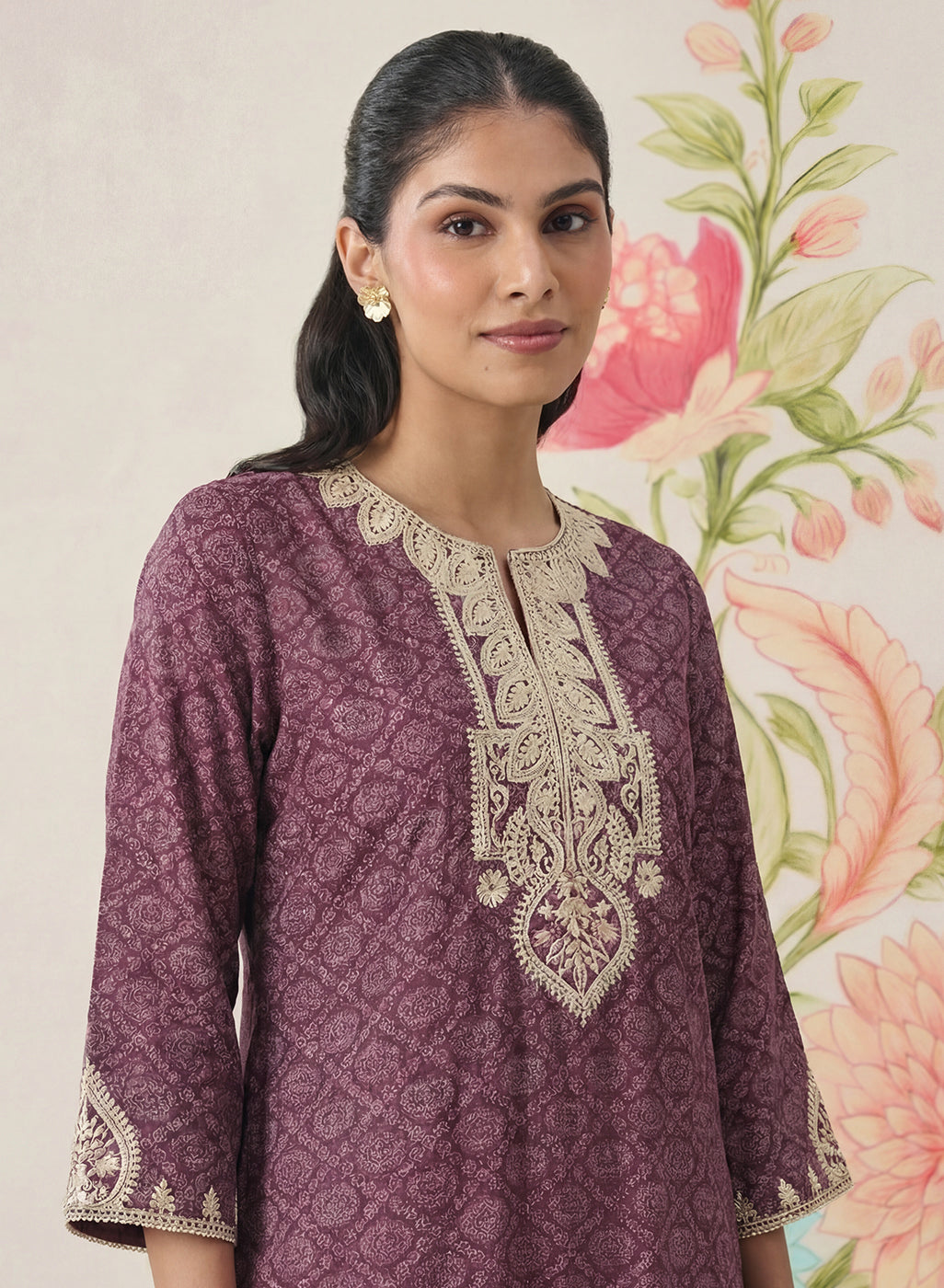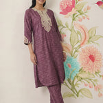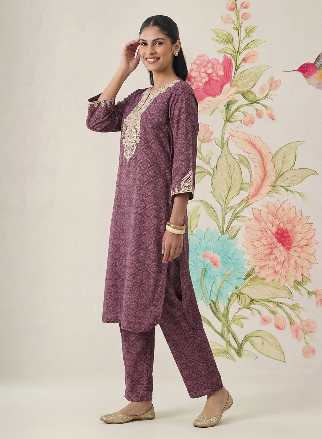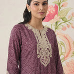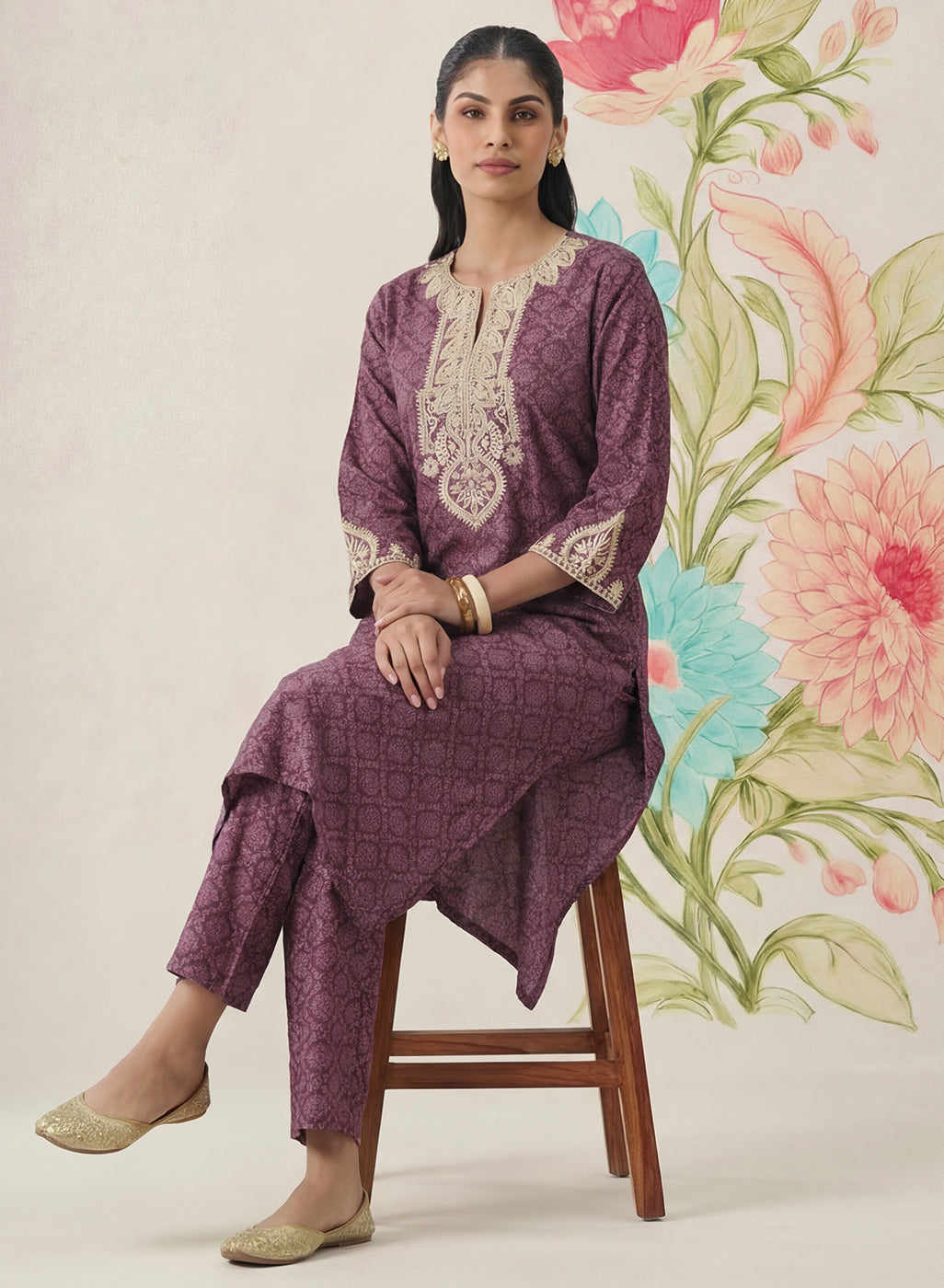 Soft and feminine, this Purple kurta set is crafted for effortless everyday elegance. Made from a breathable cotton blend, the delicate all-over print adds gentle charm, while dori embroidery with subtle sequin highlights on the neckline and sleeves lends a touch of festive sparkle.