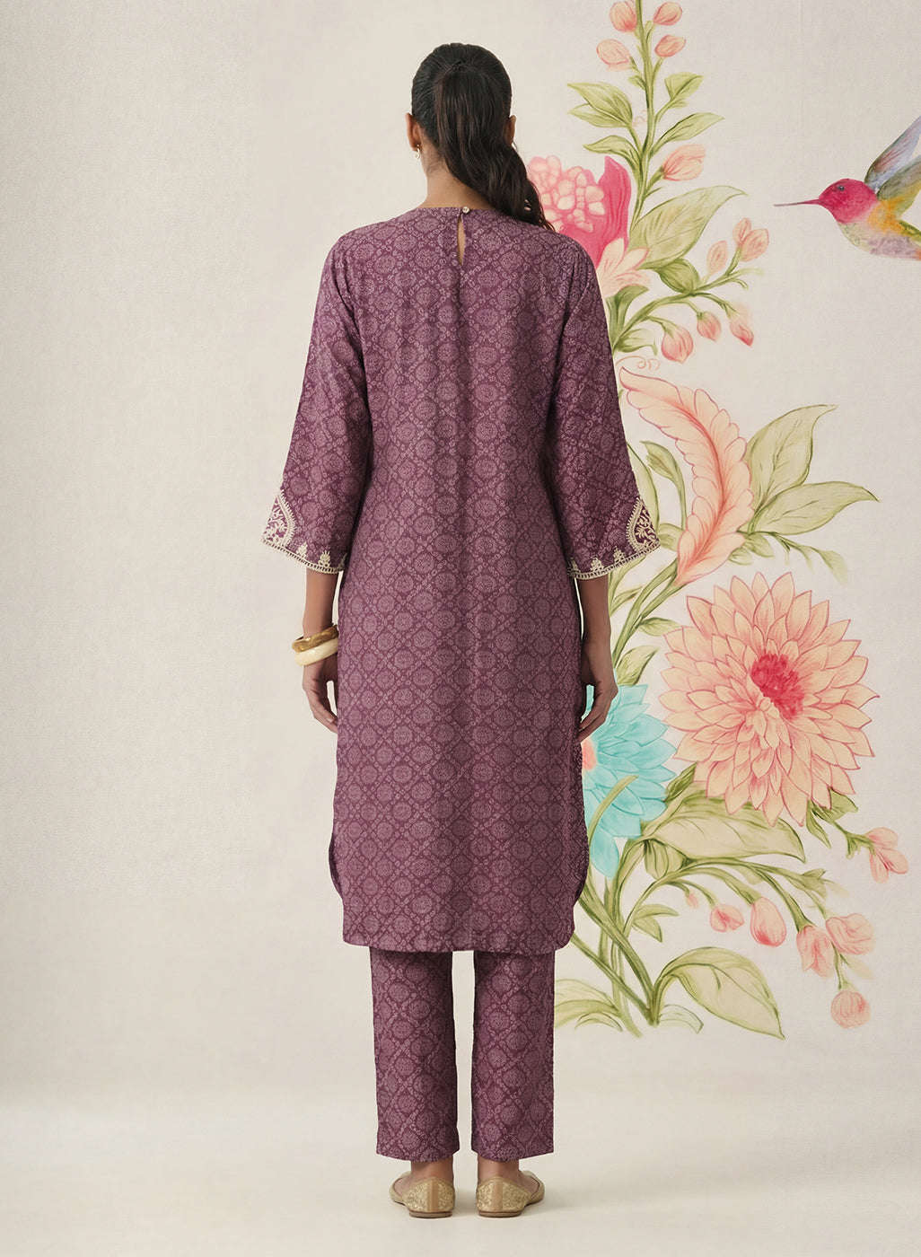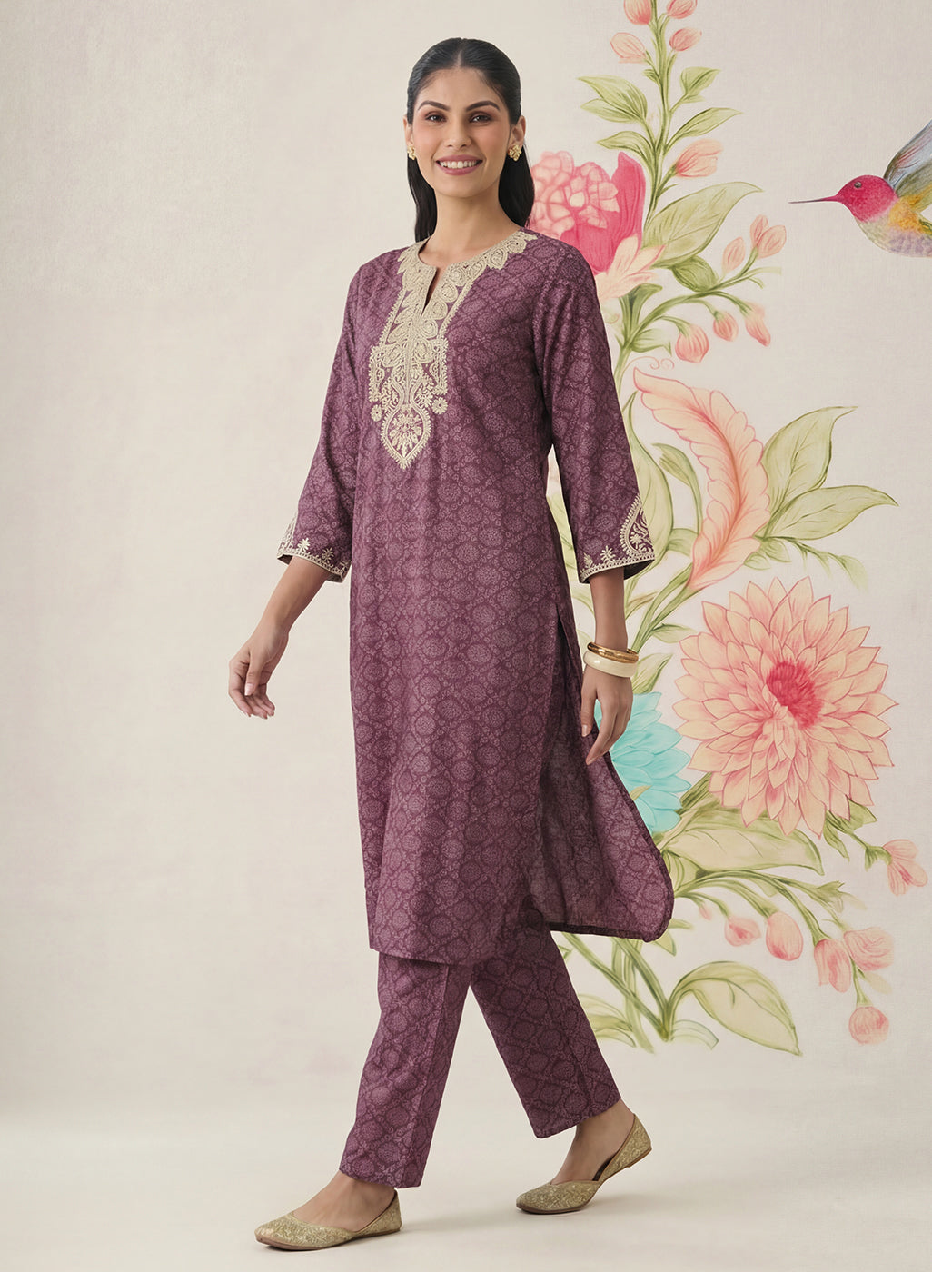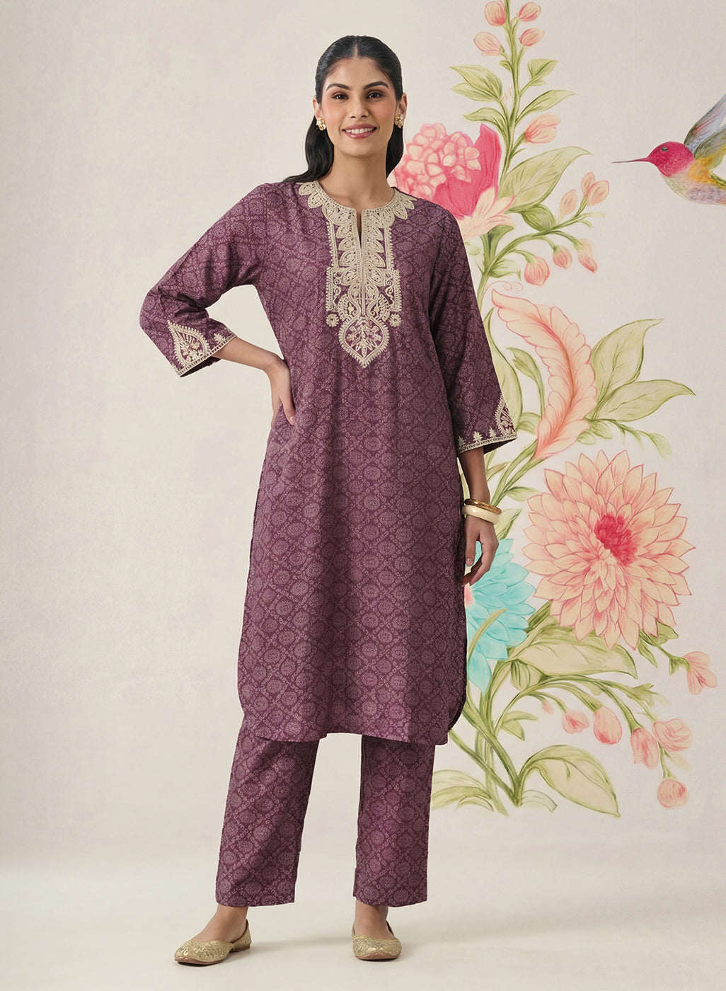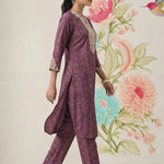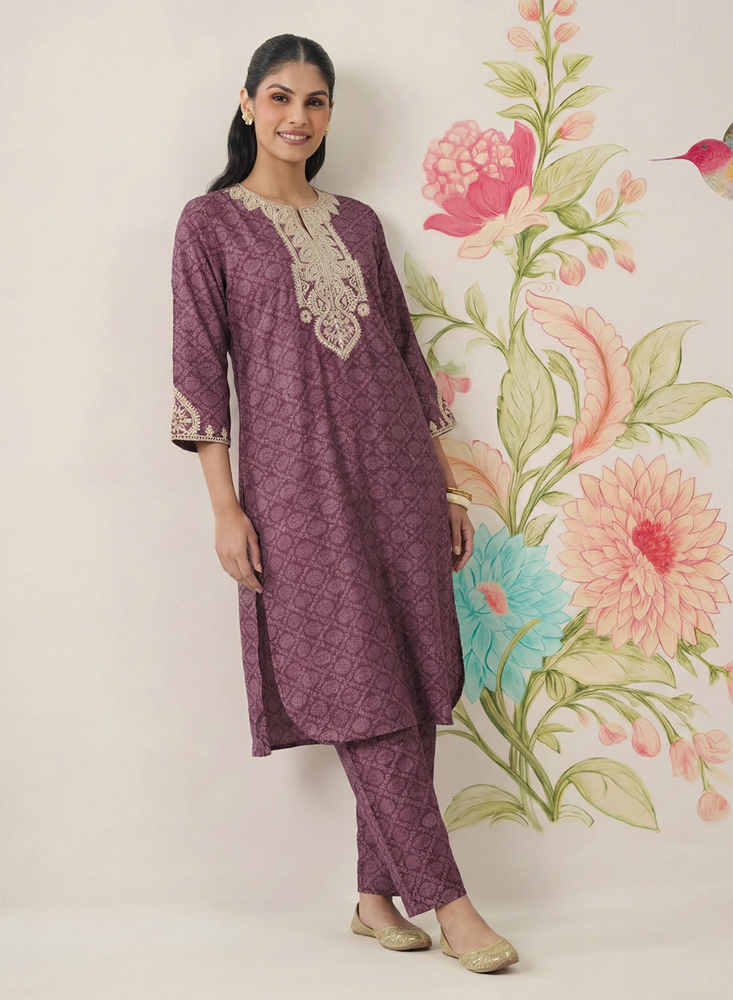 Soft and feminine, this Purple kurta set is crafted for effortless everyday elegance. Made from a breathable cotton blend, the delicate all-over print adds gentle charm, while dori embroidery with subtle sequin highlights on the neckline and sleeves lends a touch of festive sparkle.