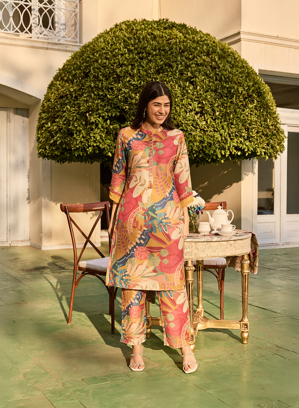 The Laura Printed Ethnic Co-ord Set for Women is designed for evening gatherings, offering both style and comfort. Made from lightweight, soft, and breathable muslin fabric, this co-ord set features an all-over print that adds a lively touch.