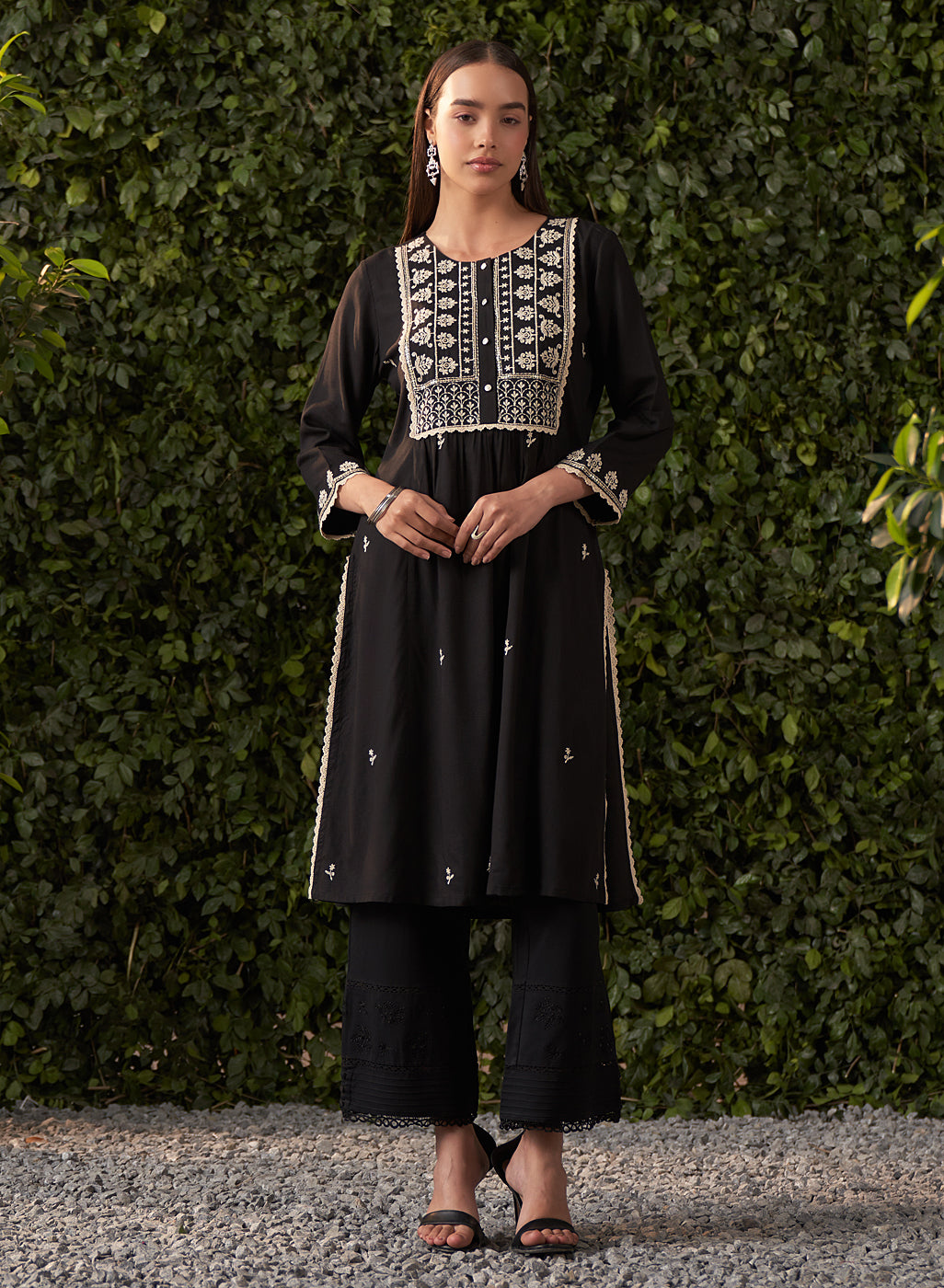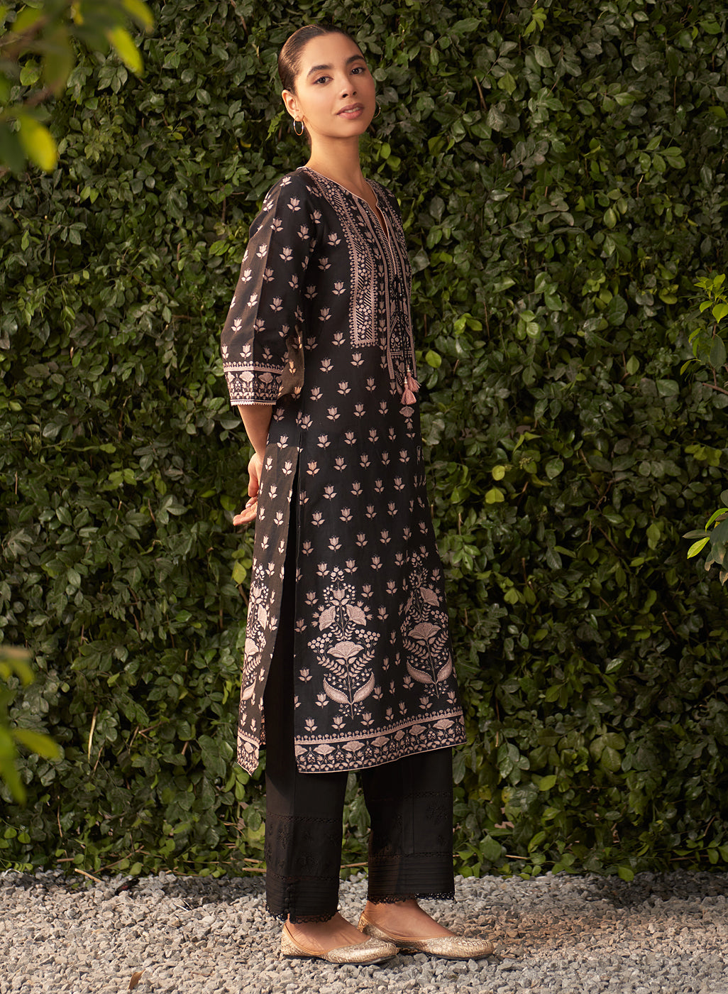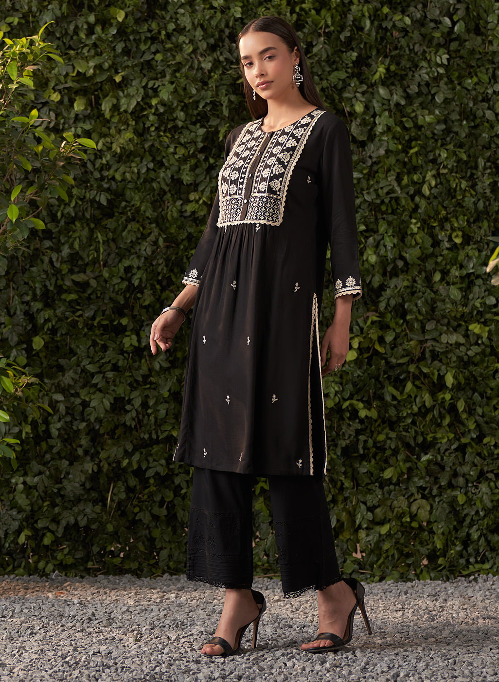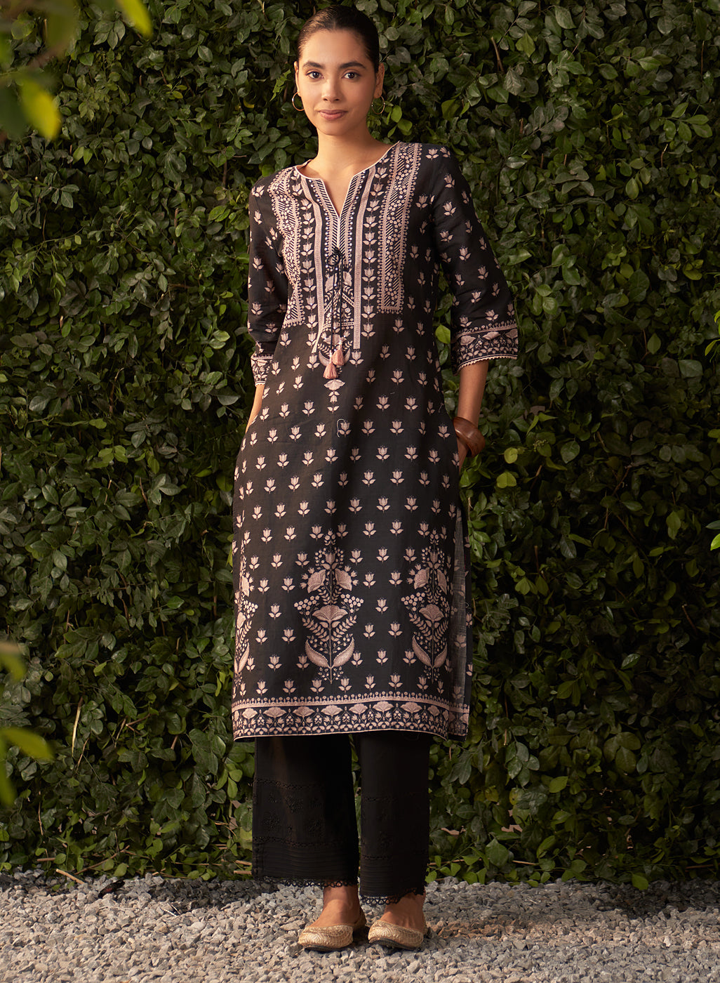 Niya Black Embroidered Cotton Linen Slub Long Top for Women