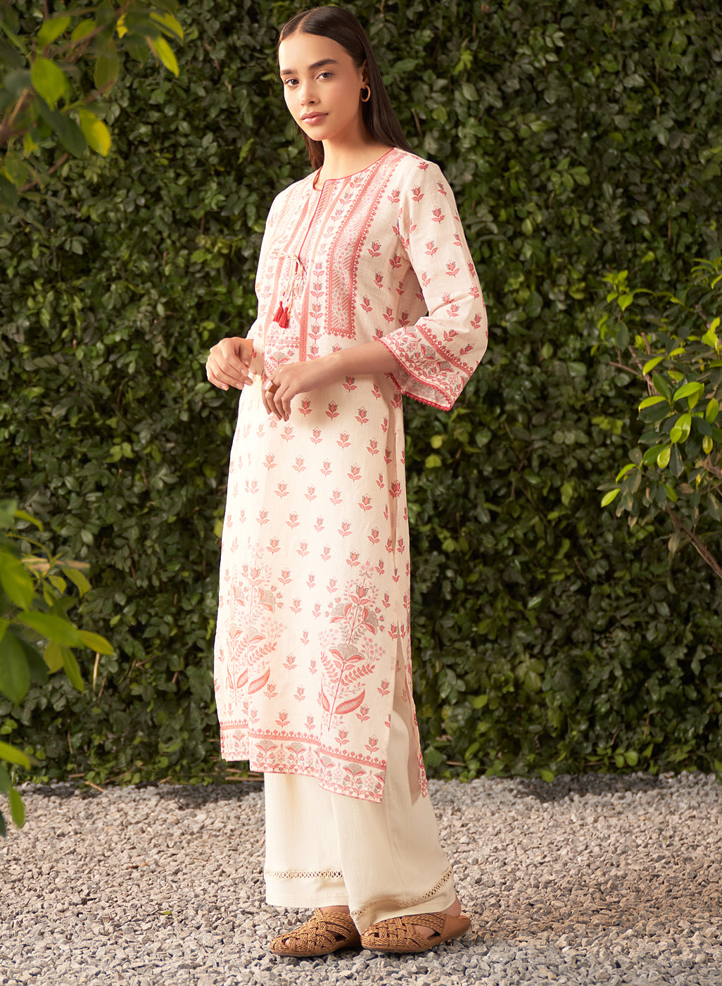 Niya Ivory Embroidered Cotton Linen Slub Long Top for Women