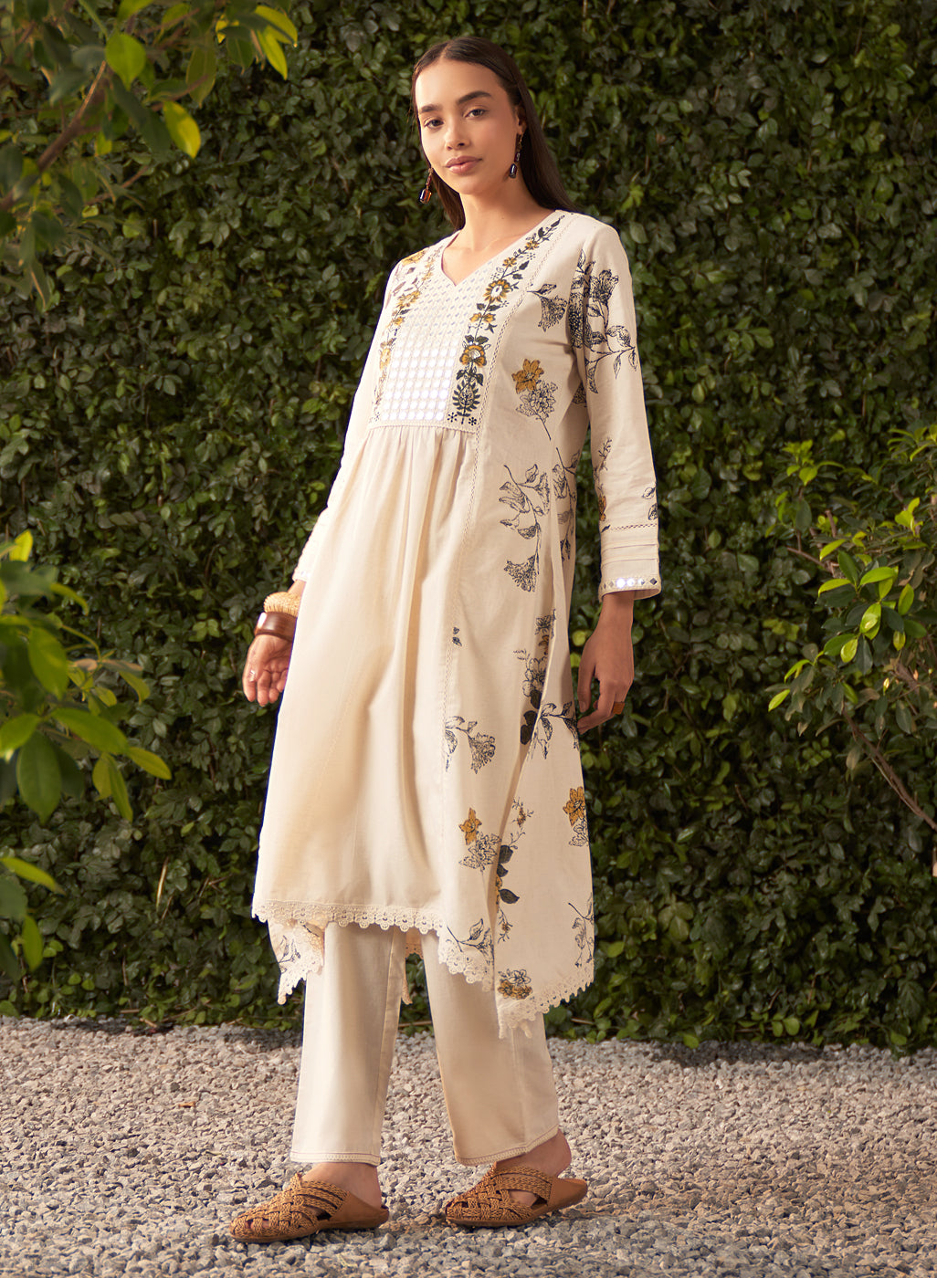 Beige Embroidered Chanderi Jacquard Kurta Set