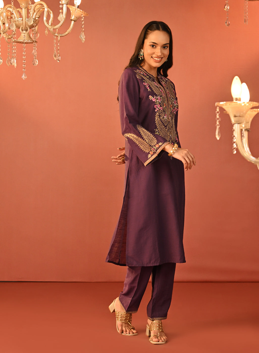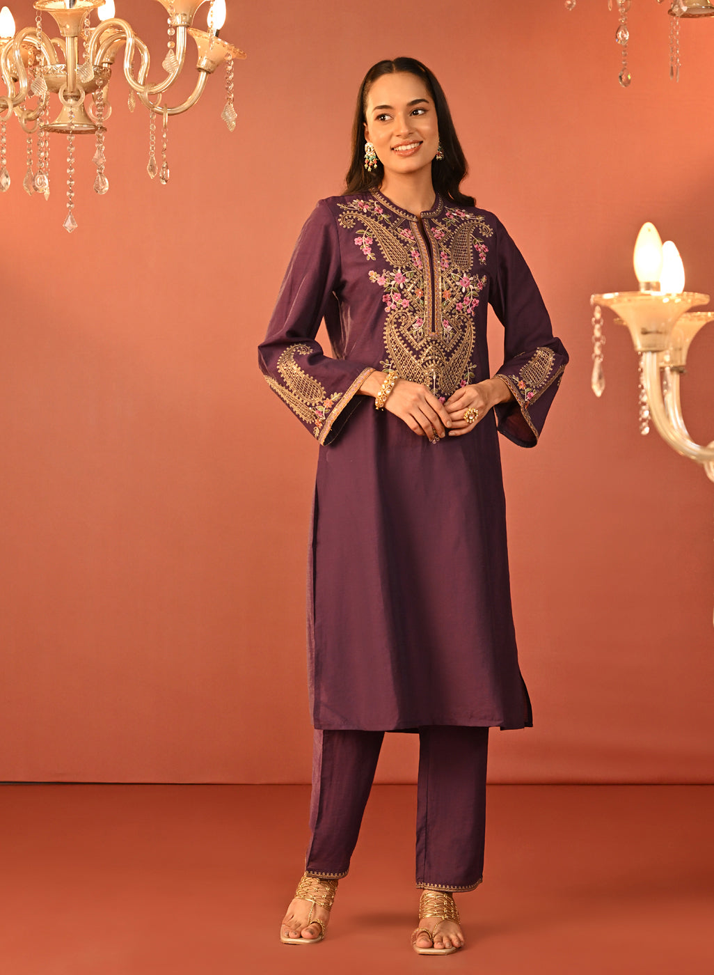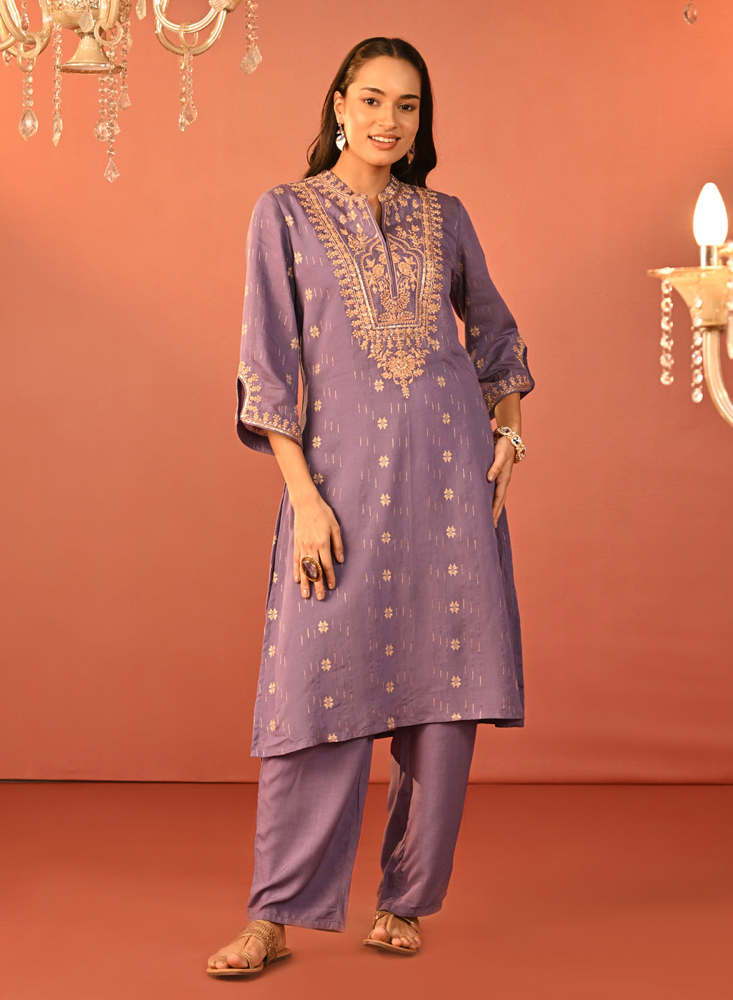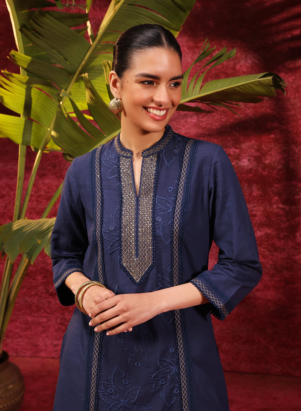 Vintage Blue Embroidered Chanderi Jacquard Kurta Set