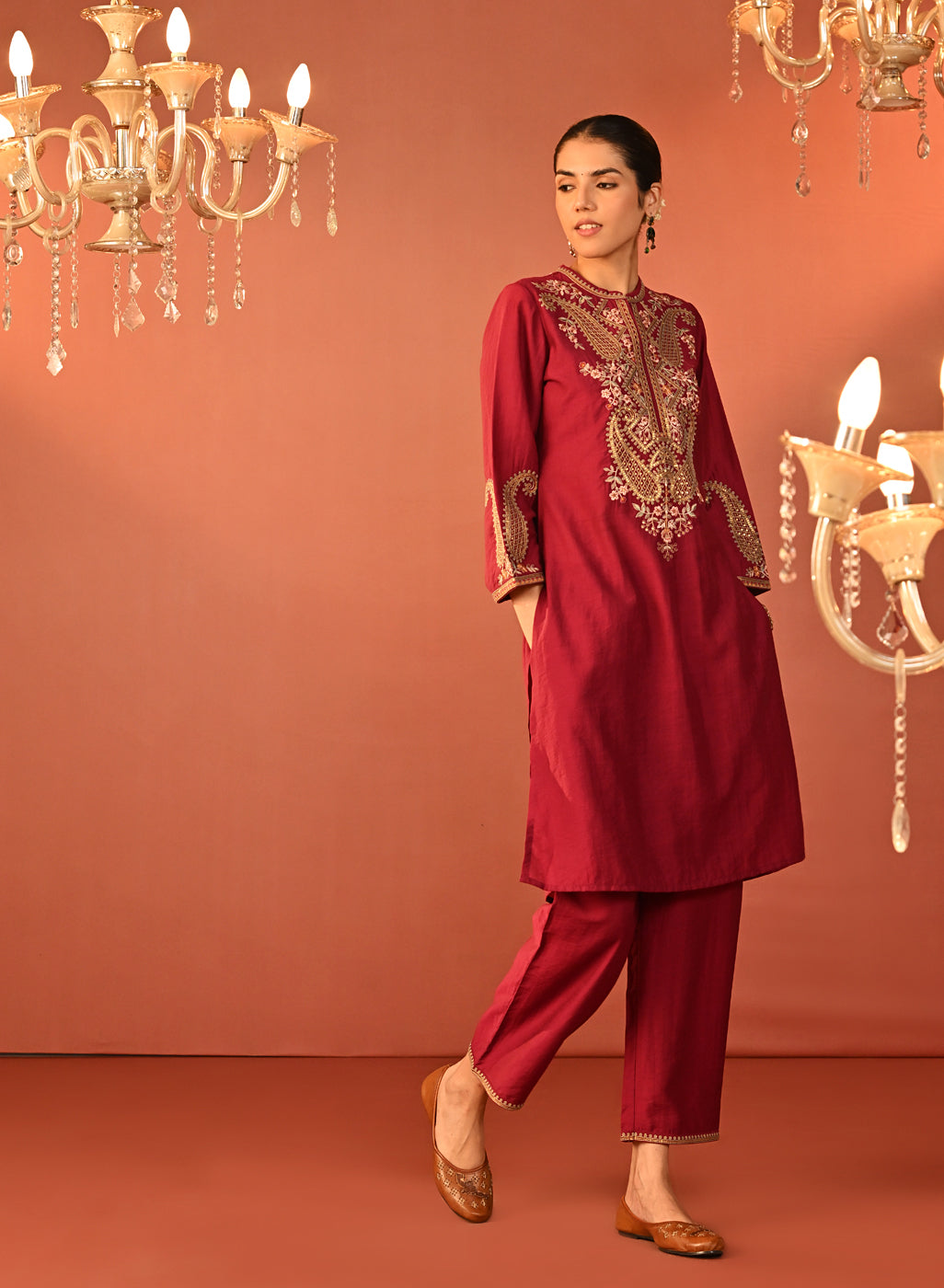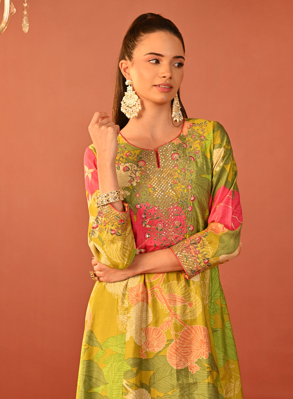 Green Monochrome Embroidery Rayon Slub Kurta Set