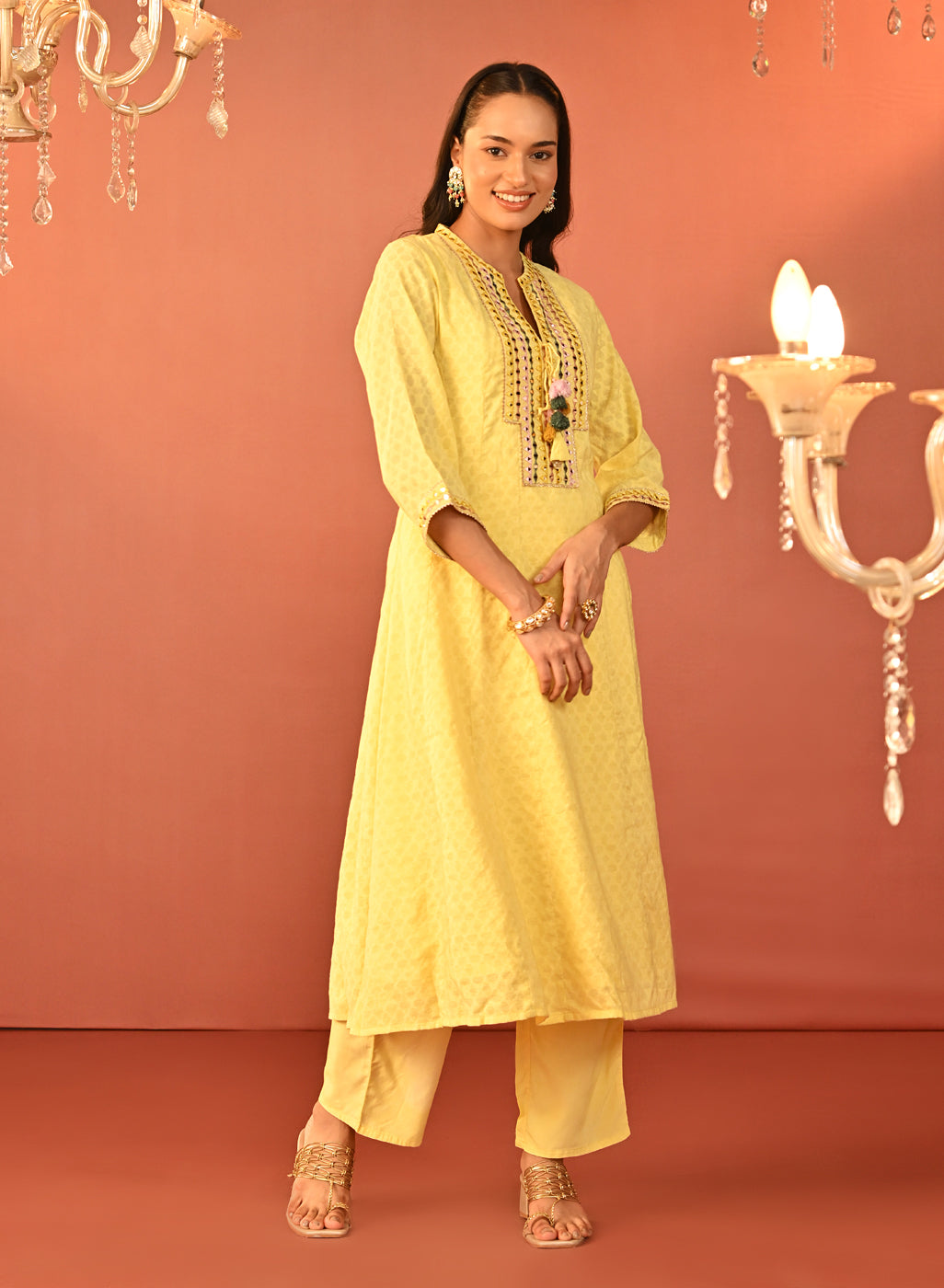 Lemon Embroidered Cotton Jacquard Kurta Set