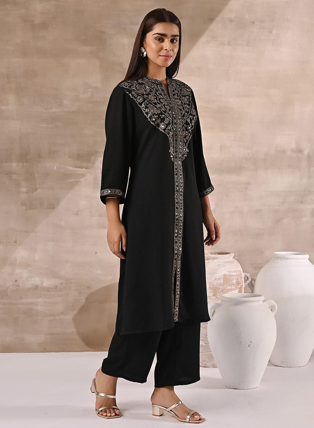 Black Kurta Set With Intricate Embroidery & Front Slit - Lakshita