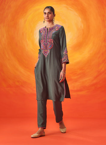 Set against a deep black base, the multicolour Kashmiri-inspired embroidery stands out beautifully, adding depth and richness to this timeless silhouette. The clean lines of the kurta are softened with the detailed threadwork, making it an elegant choice for both day and evening occasions.