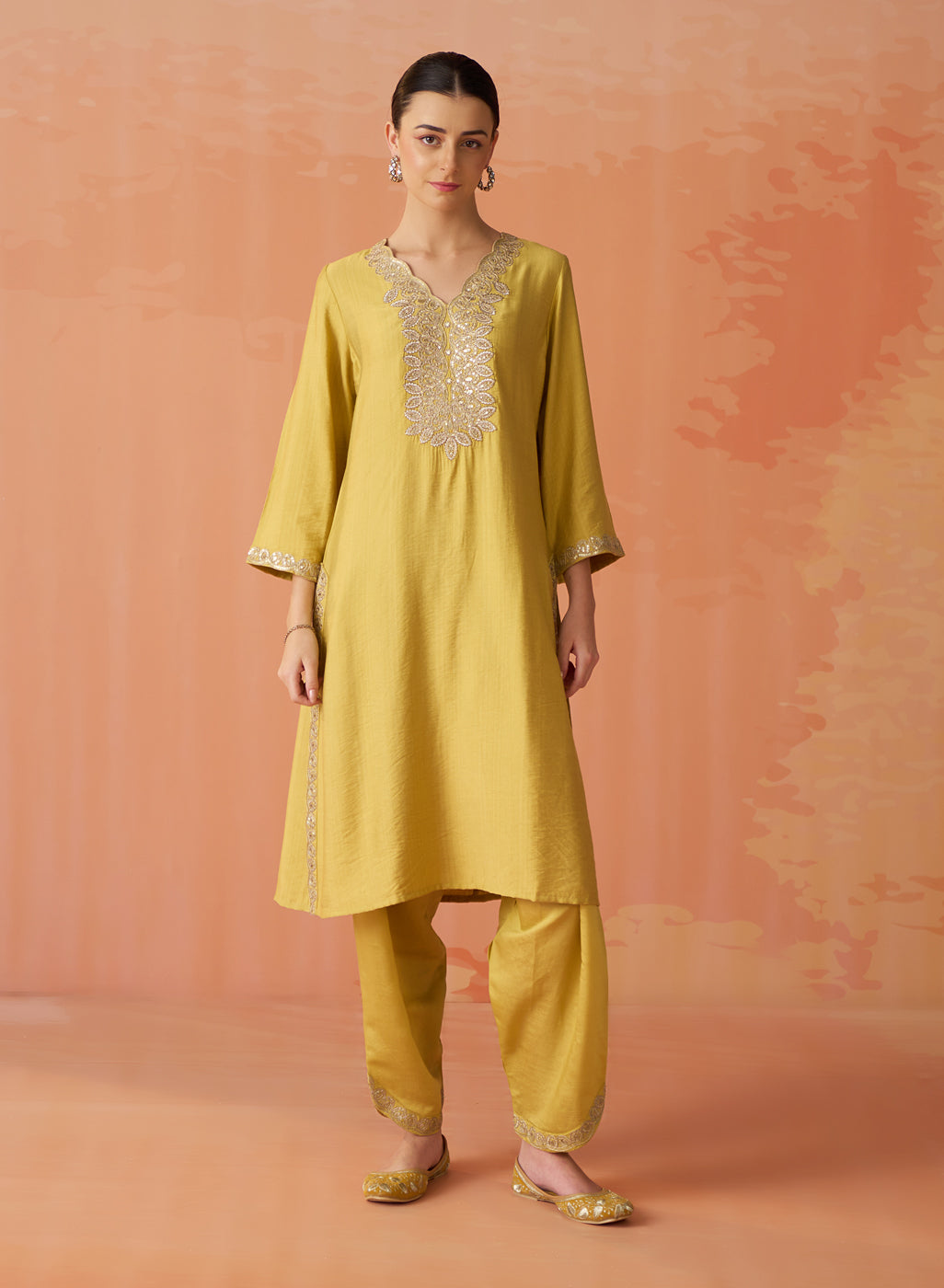 Lemon Embroidered Cotton Jacquard Kurta Set