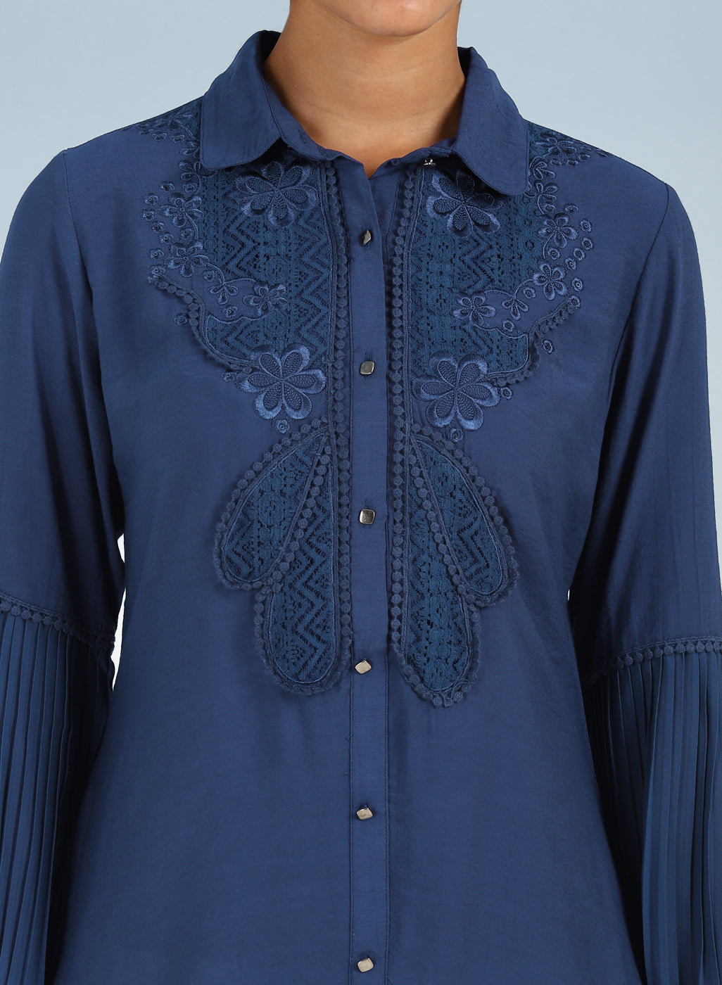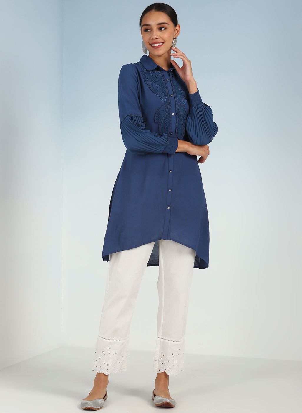 Navy Blue Women Woollen Kurti with Inserts and Zari Work