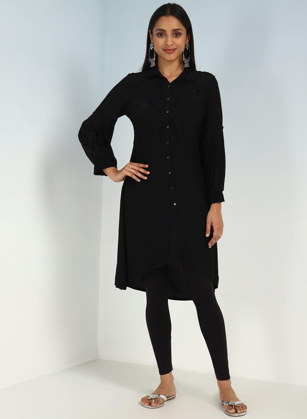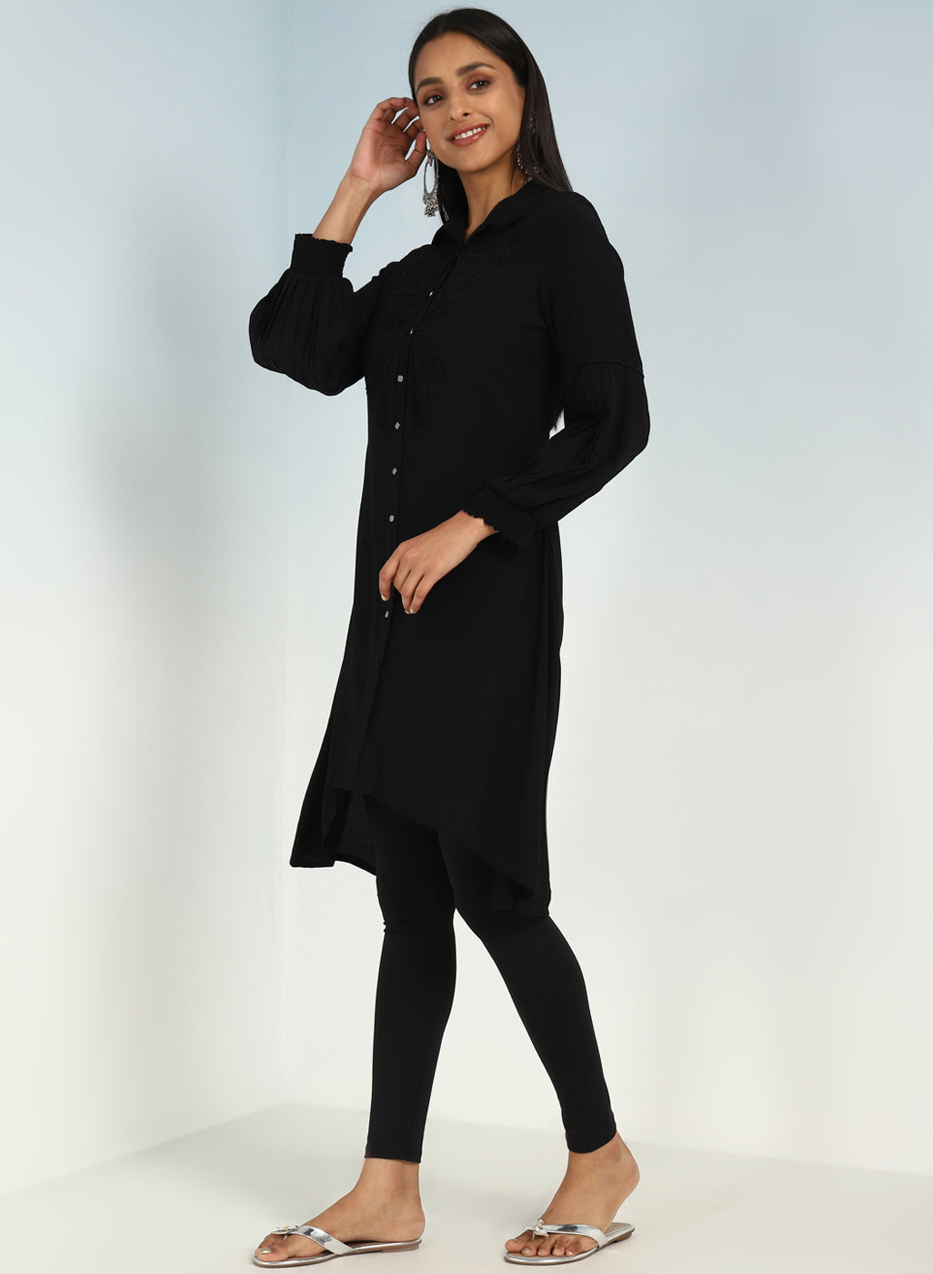 Black Woollen Kurta for Women with Leather Collar and Sequin Work