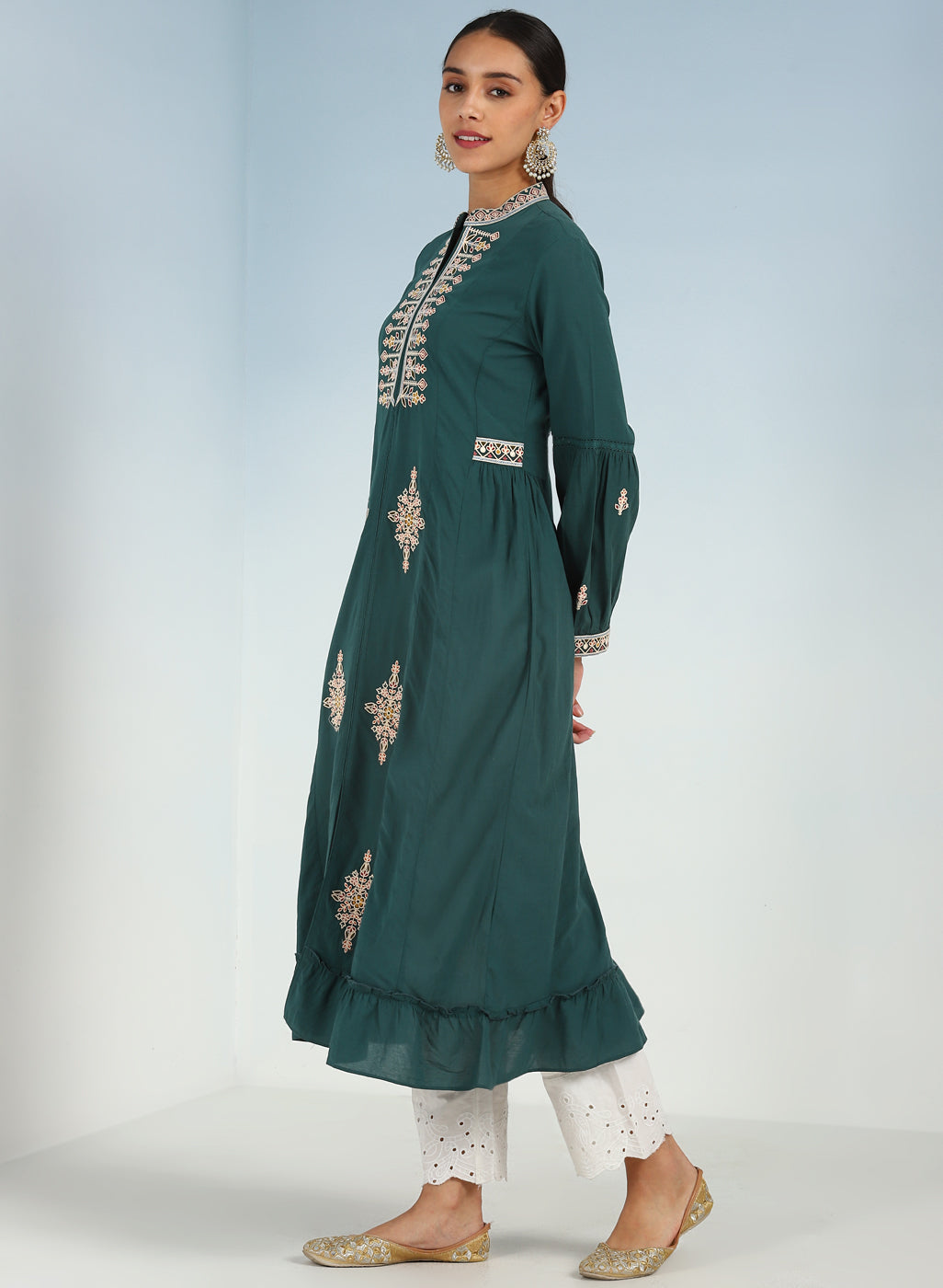 Essex Green Woollen Kurta for Women with Leather Collar and Sequin Work