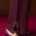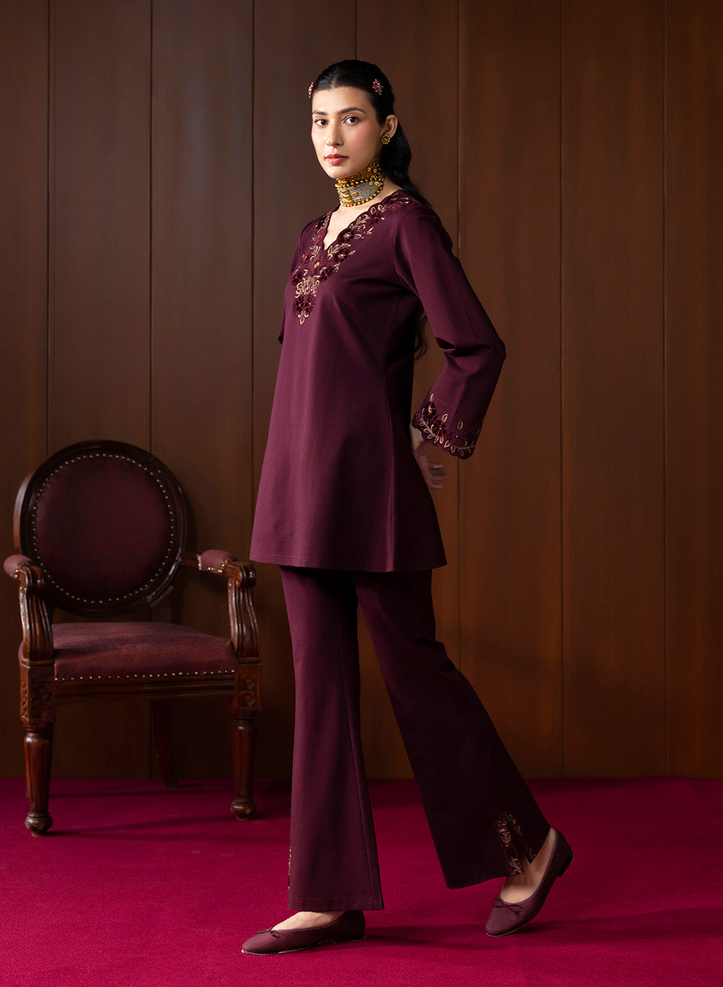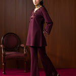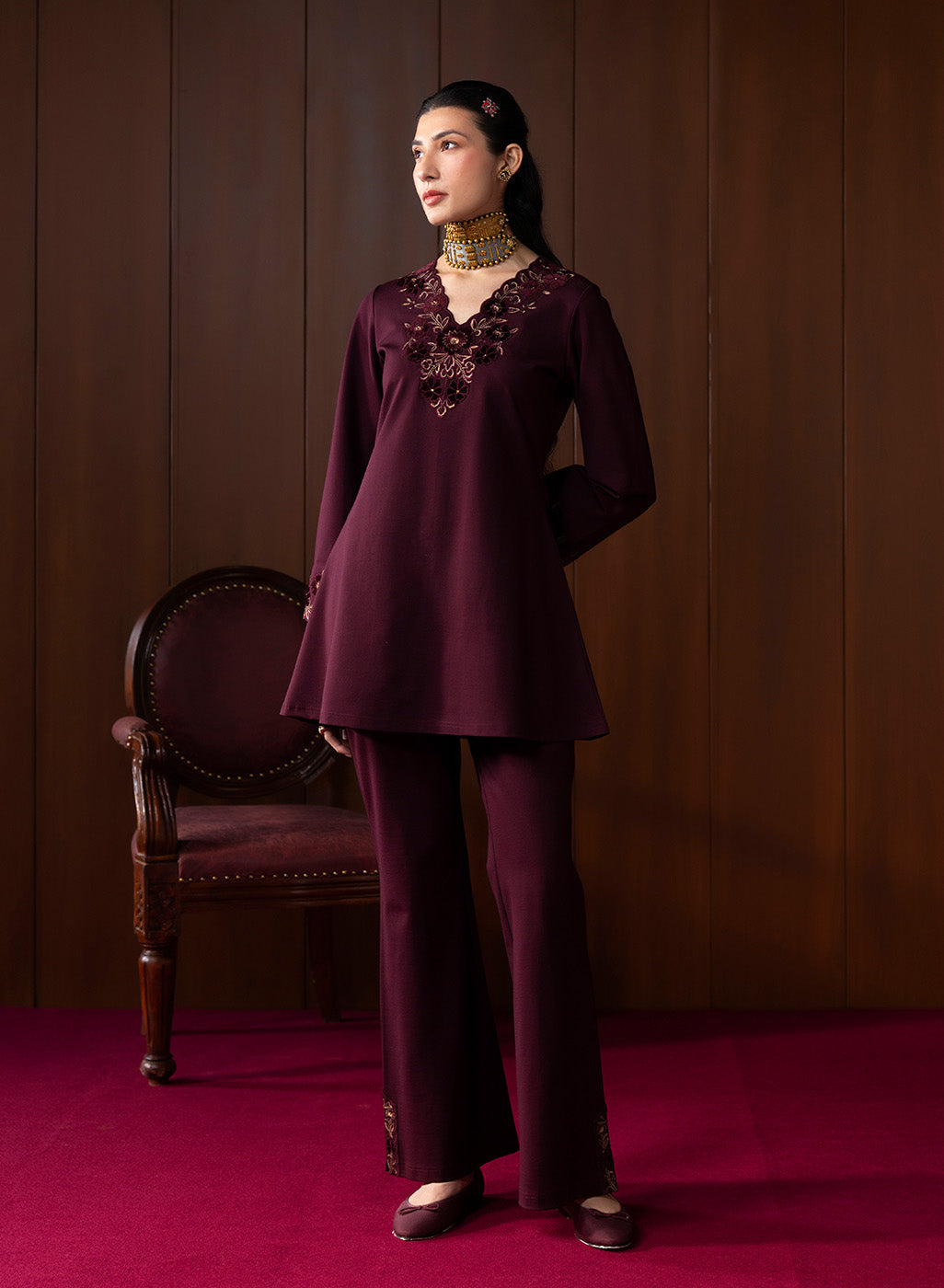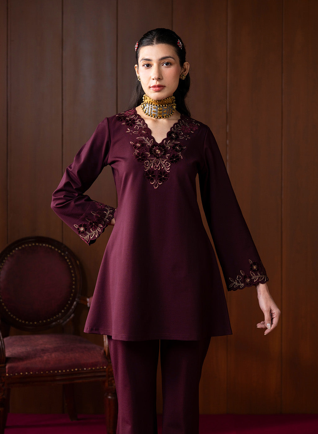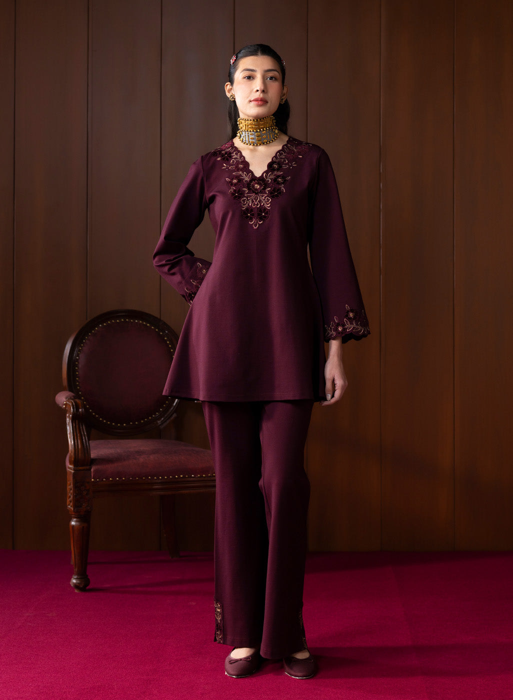 Rich, warm and effortlessly refined, this maroon co-ord set pairs soft fabric with intricate Resham embroidery and velvet appliqué for a look that feels both festive and understated. A scalloped V-neckline and delicately embroidered bell sleeves add feminine charm, while straight-cut pants bring balance with clean, structured ease.