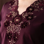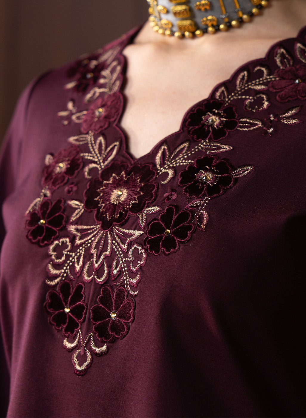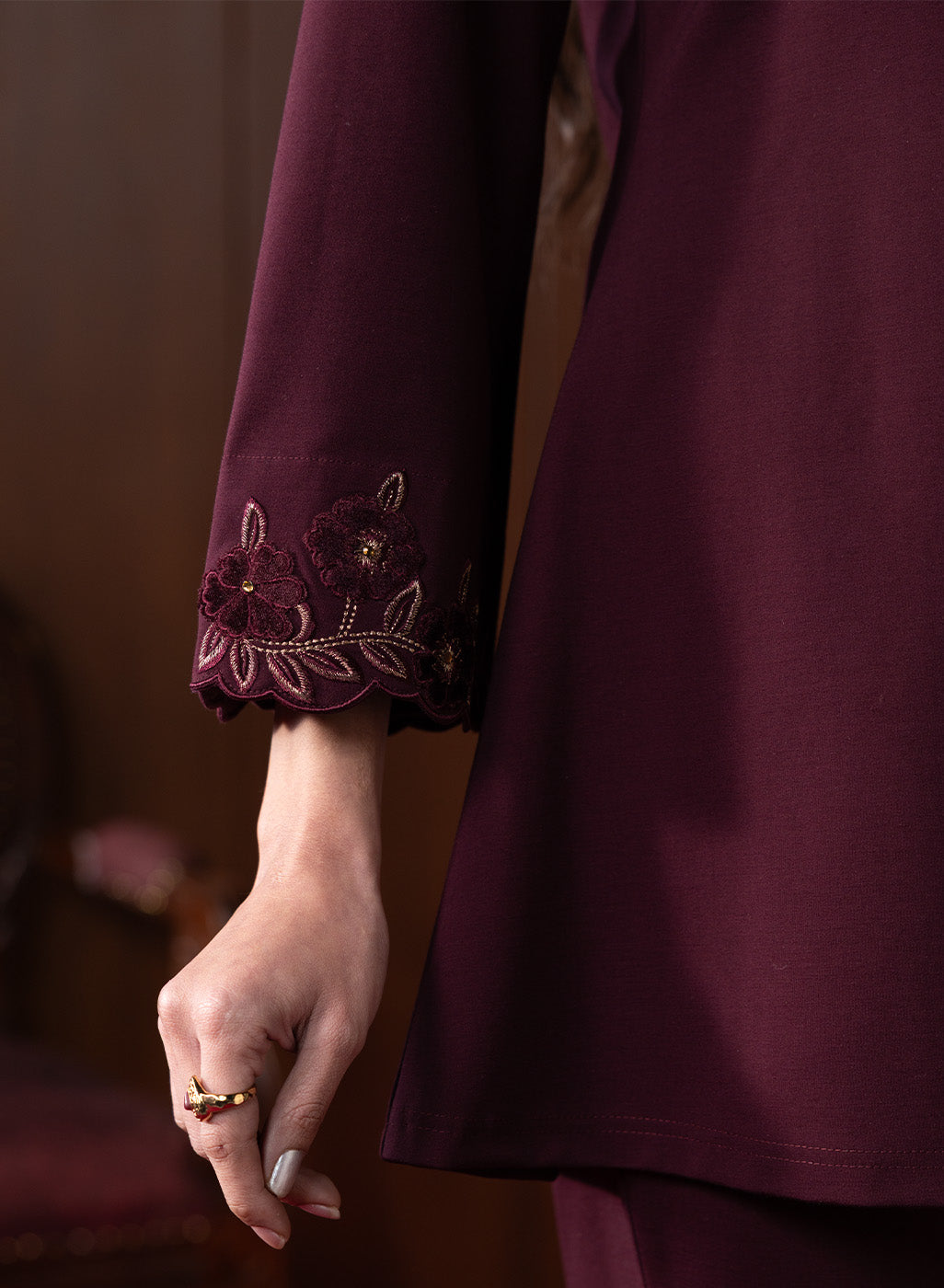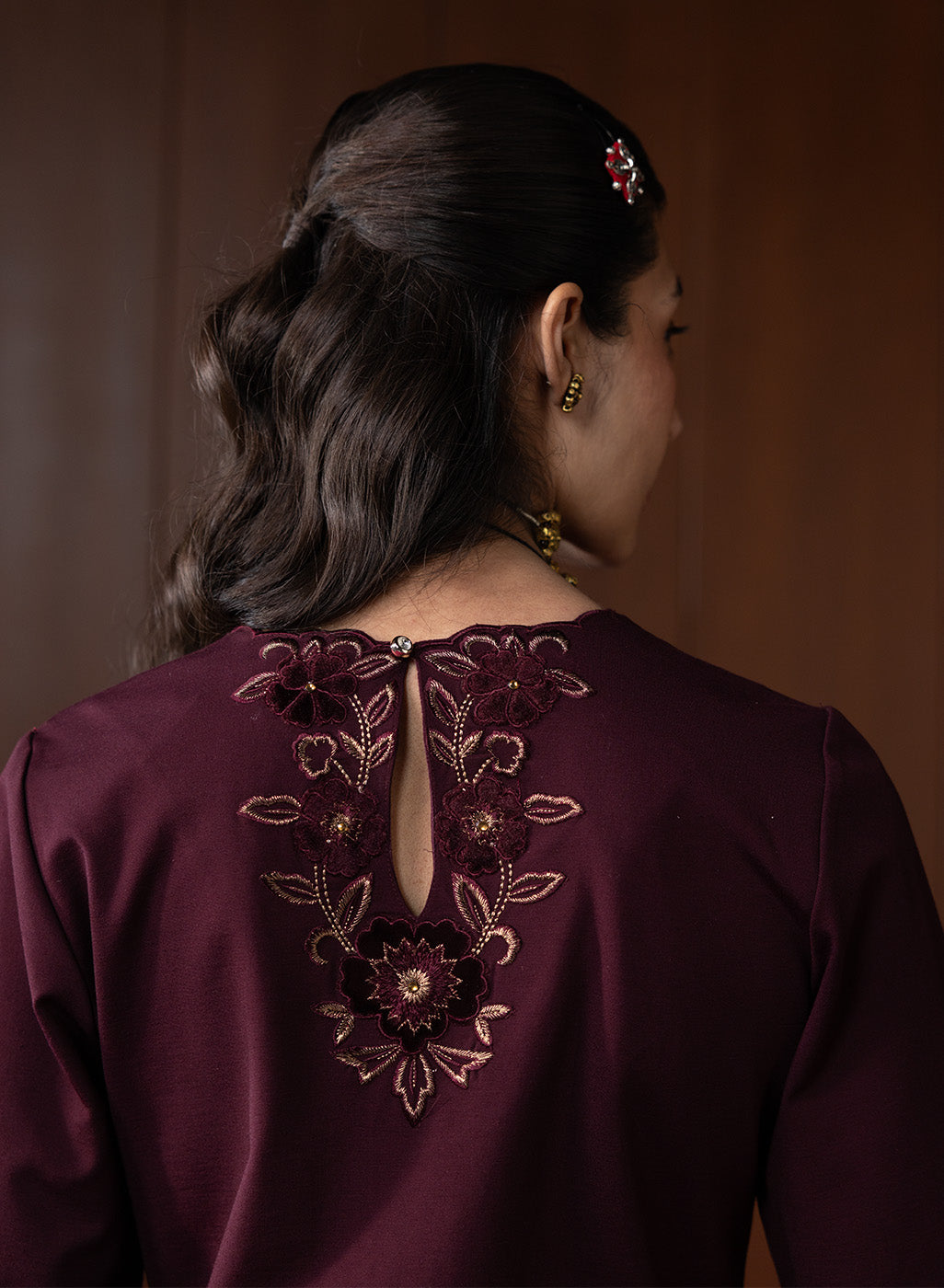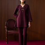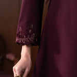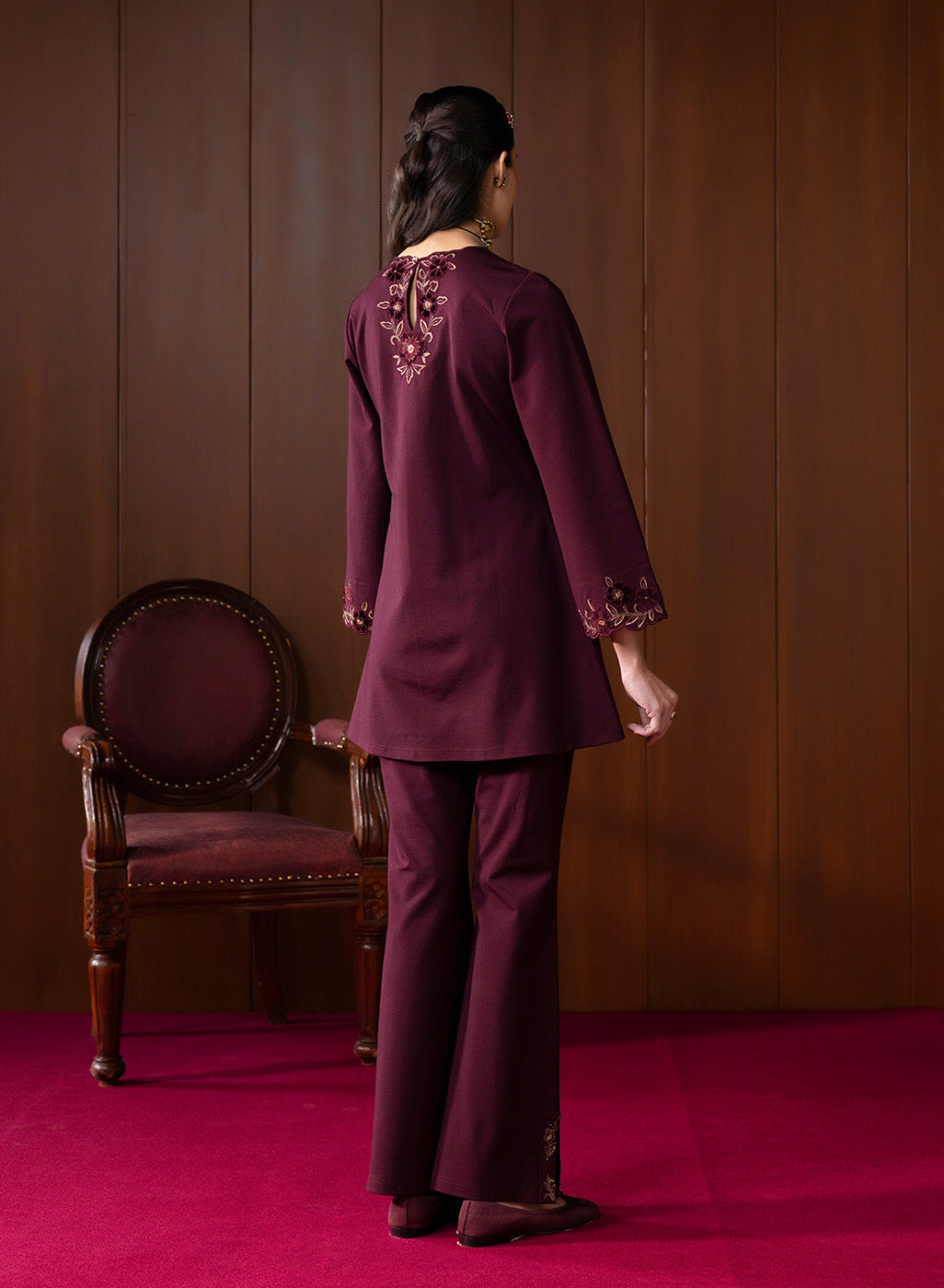Rich, warm and effortlessly refined, this maroon co-ord set pairs soft fabric with intricate Resham embroidery and velvet appliqué for a look that feels both festive and understated. A scalloped V-neckline and delicately embroidered bell sleeves add feminine charm, while straight-cut pants bring balance with clean, structured ease.