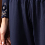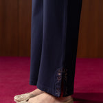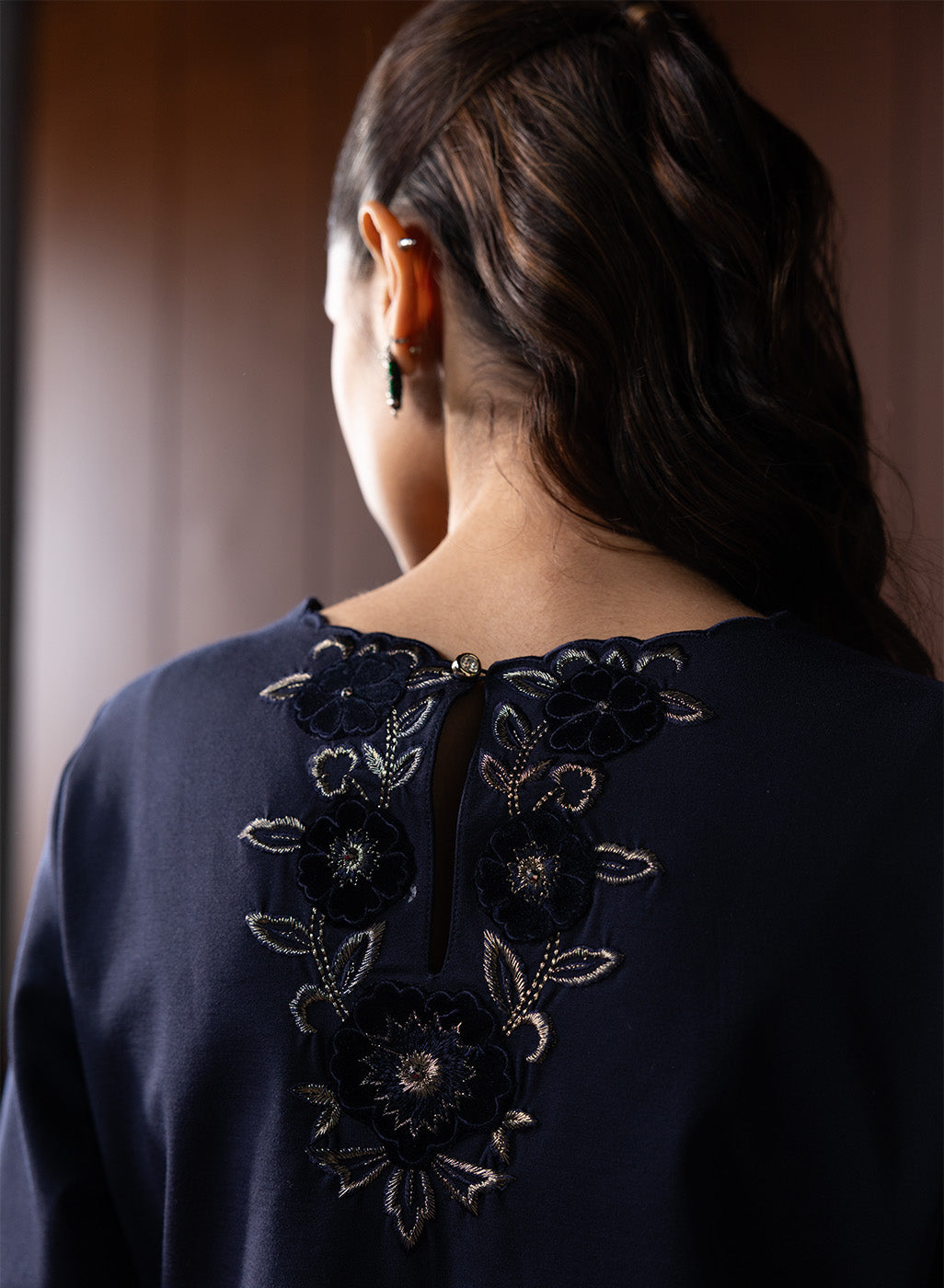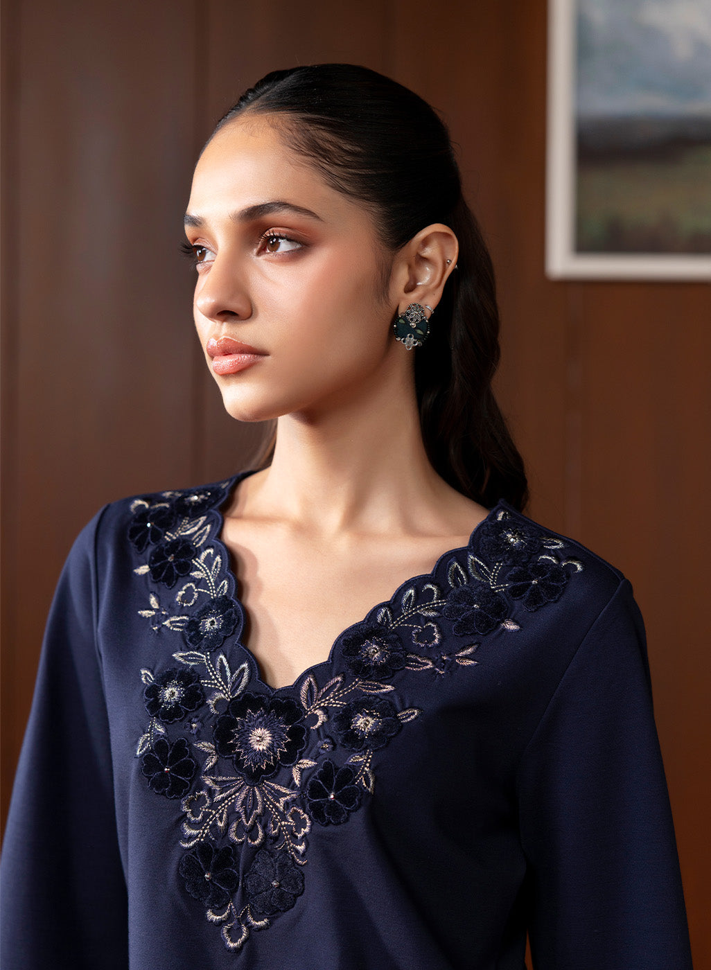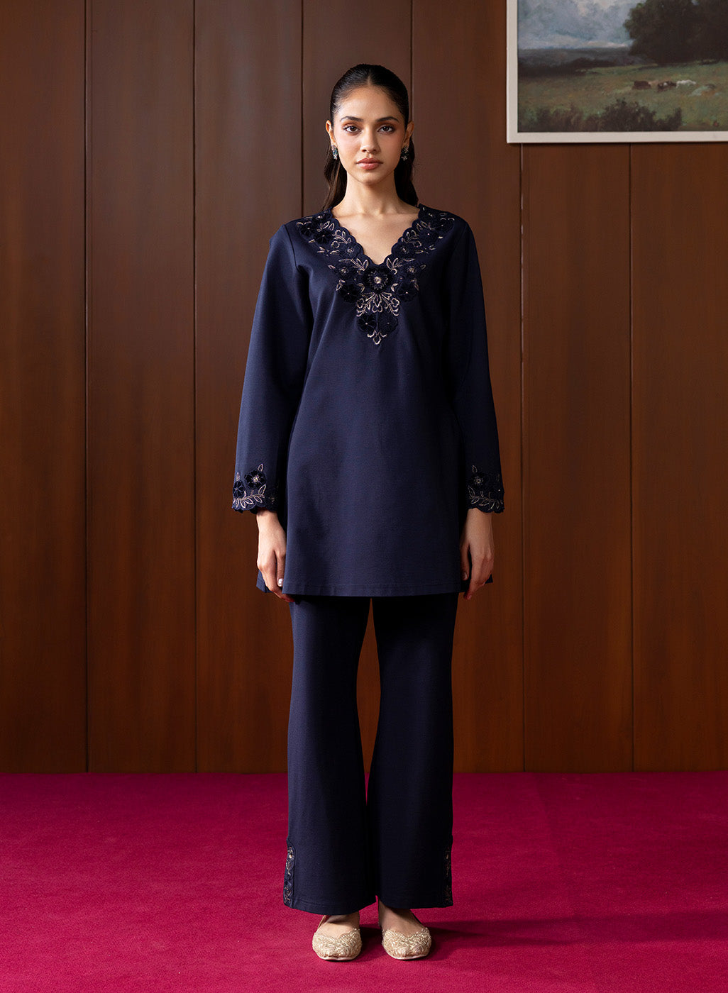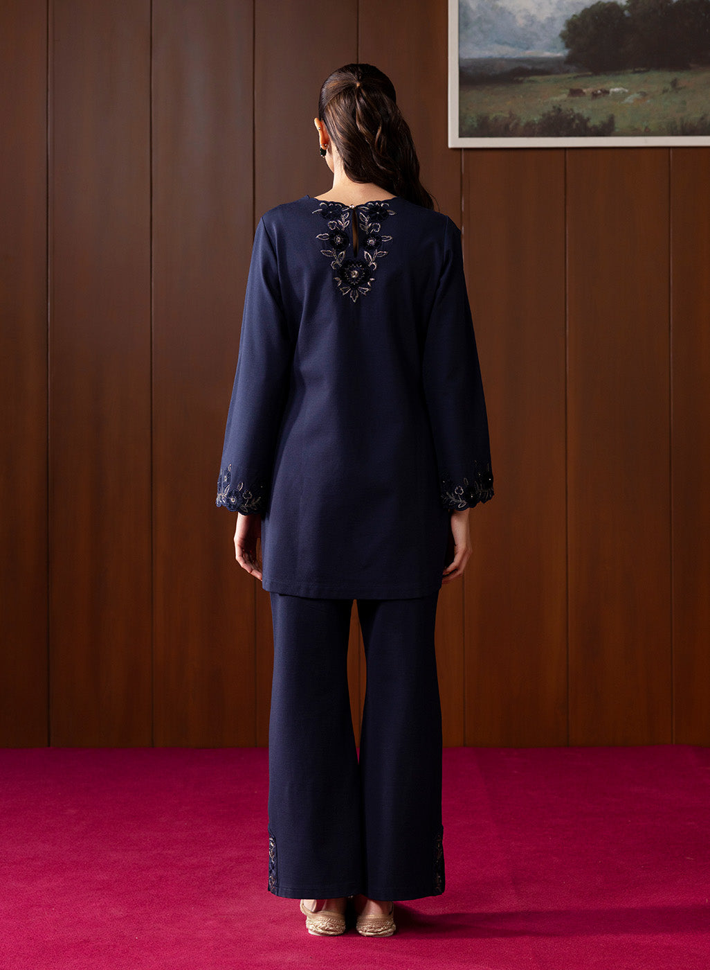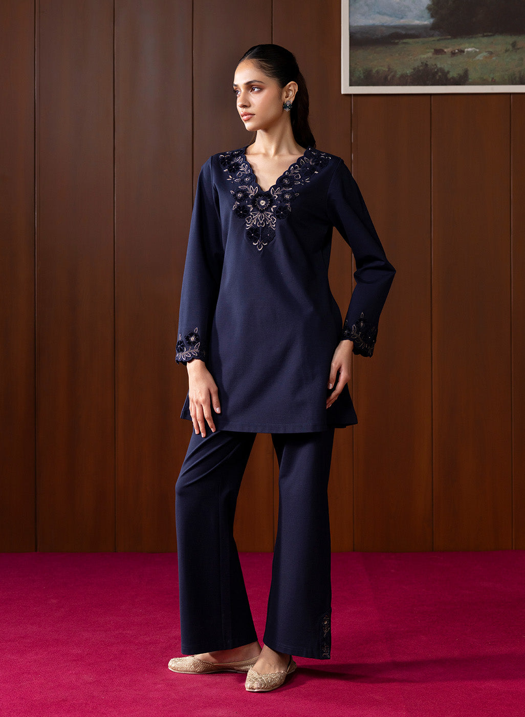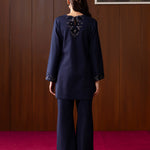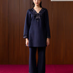 Elegant and timeless, this navy co-ord set brings a refined floral flair to winter dressing. The cool, deep hue beautifully highlights the Resham embroidery and velvet appliqué detailing, creating a sophisticated contrast. Designed with an A-line silhouette, scalloped V-neck and intricate accents, it’s a versatile ensemble that balances festive charm with modern ease.