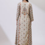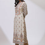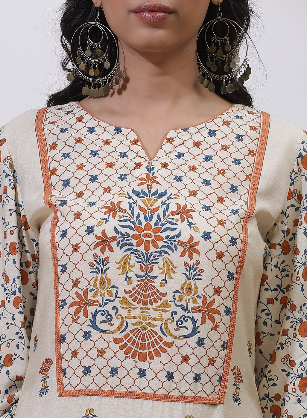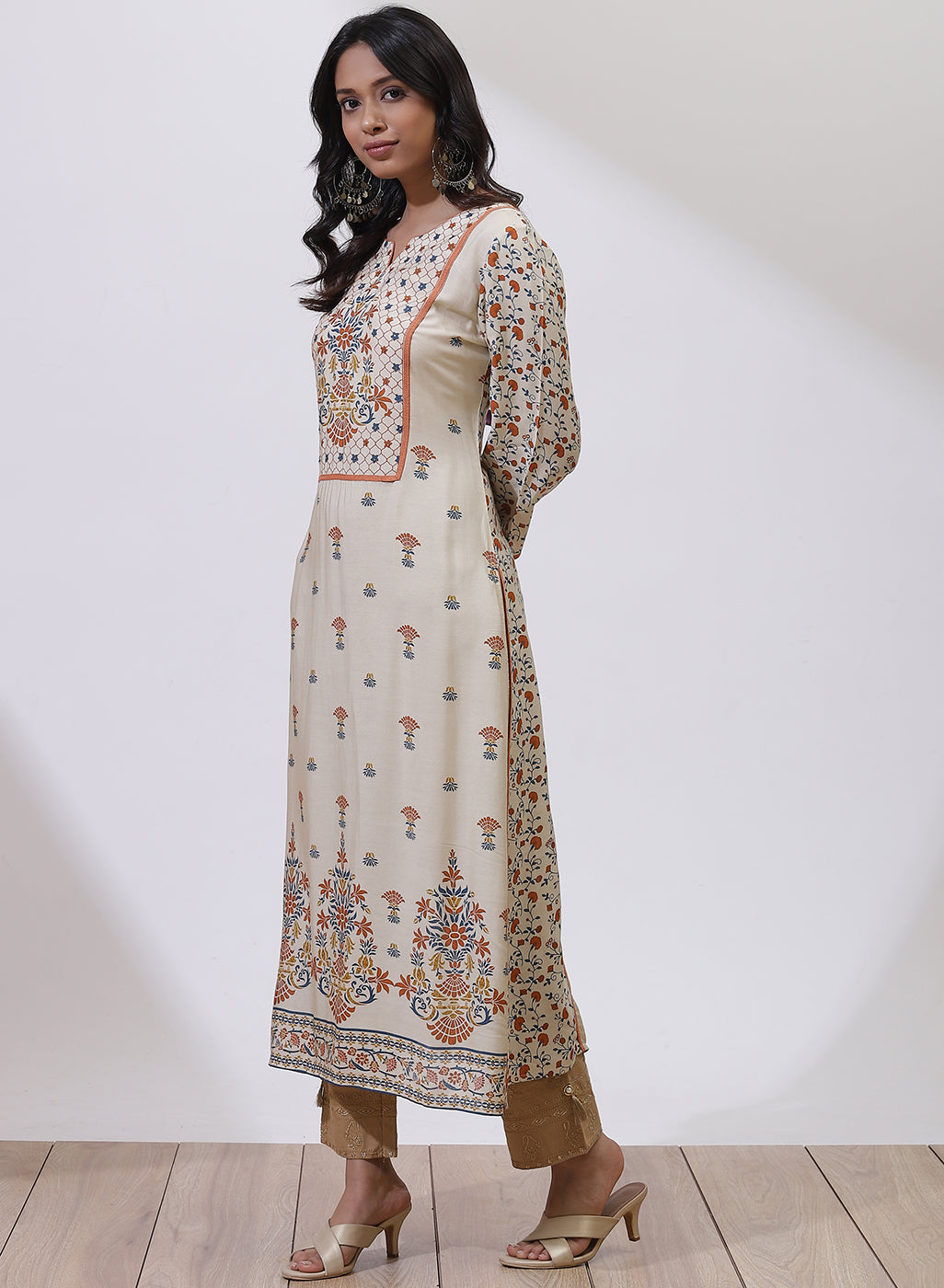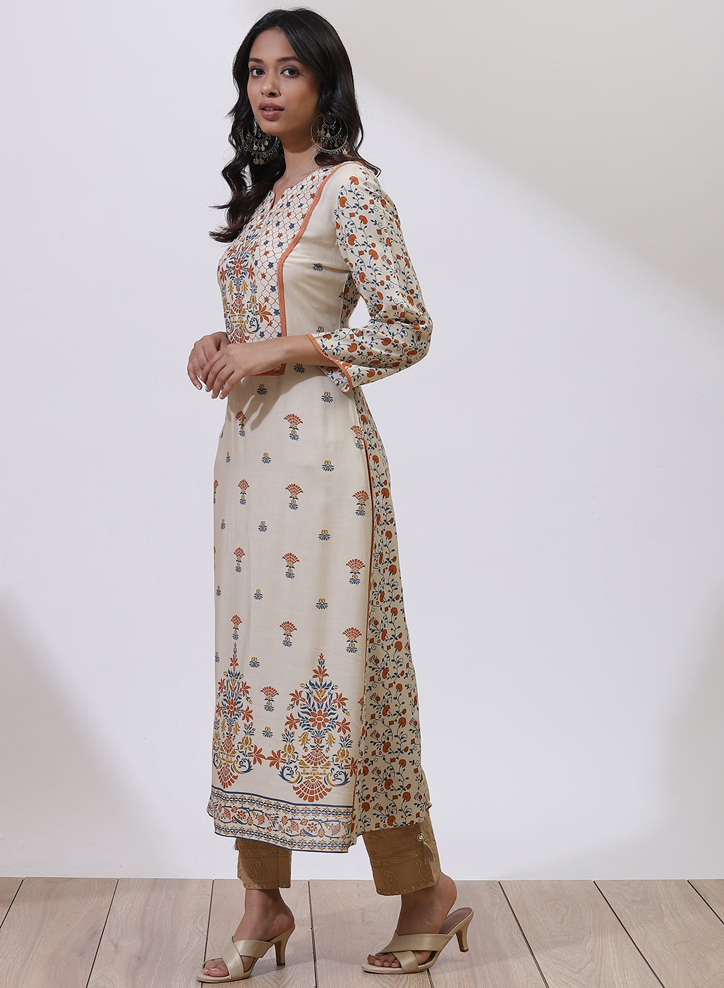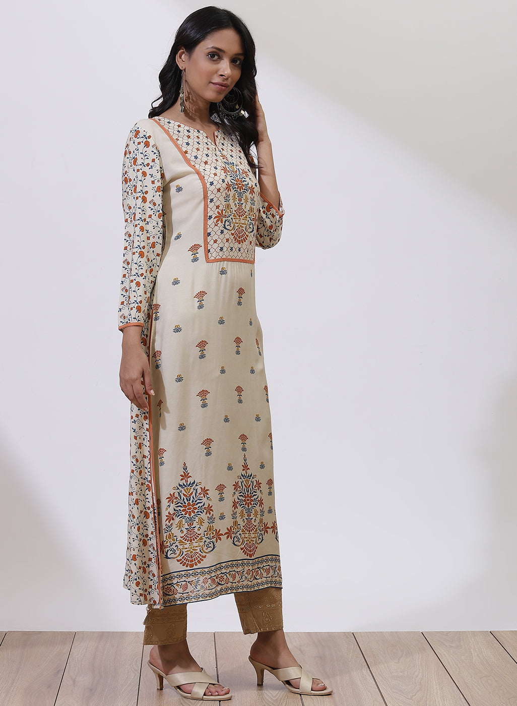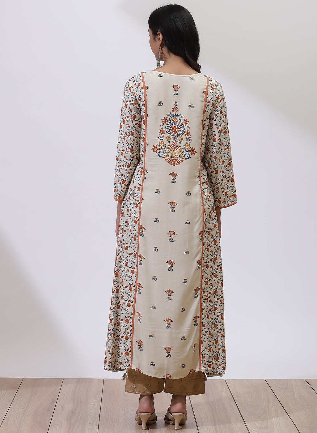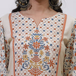 Add some extra oomph to your festive collection with this chic orange-colored printed kurta from the house of Lakshita. Tailored into a comfortable A-line silhouette, this lightweight kurta comes covered with mix and match prints all over for a feminine touch and has three-quarter sleeves. A golden woven long skirt and a statement clutch will make for a fantastic appearance