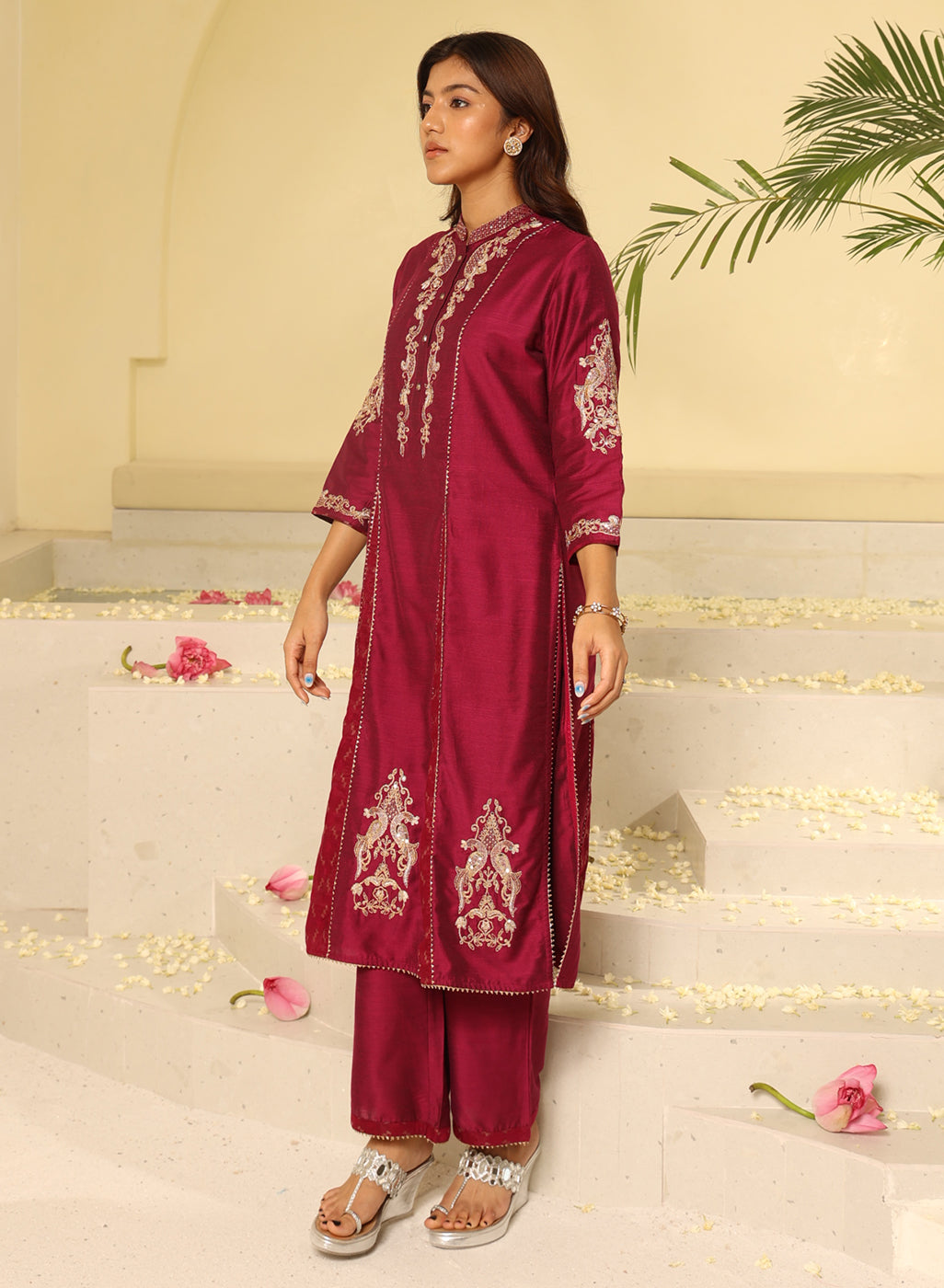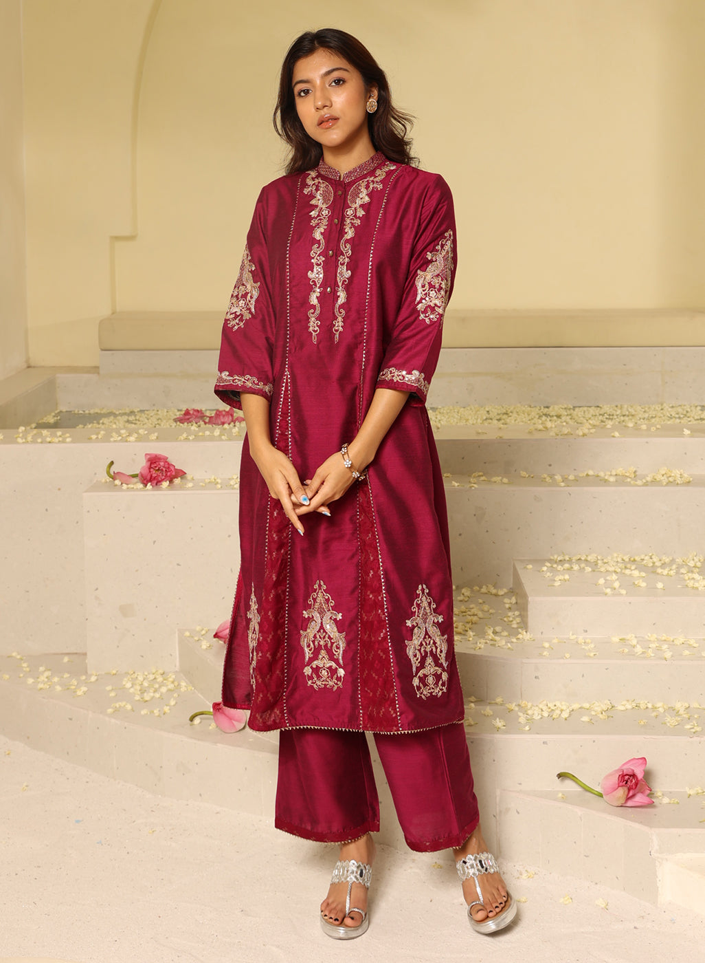 Maroon Velvet Kurta Set With Heavy Front Yoke Zari Embroidery