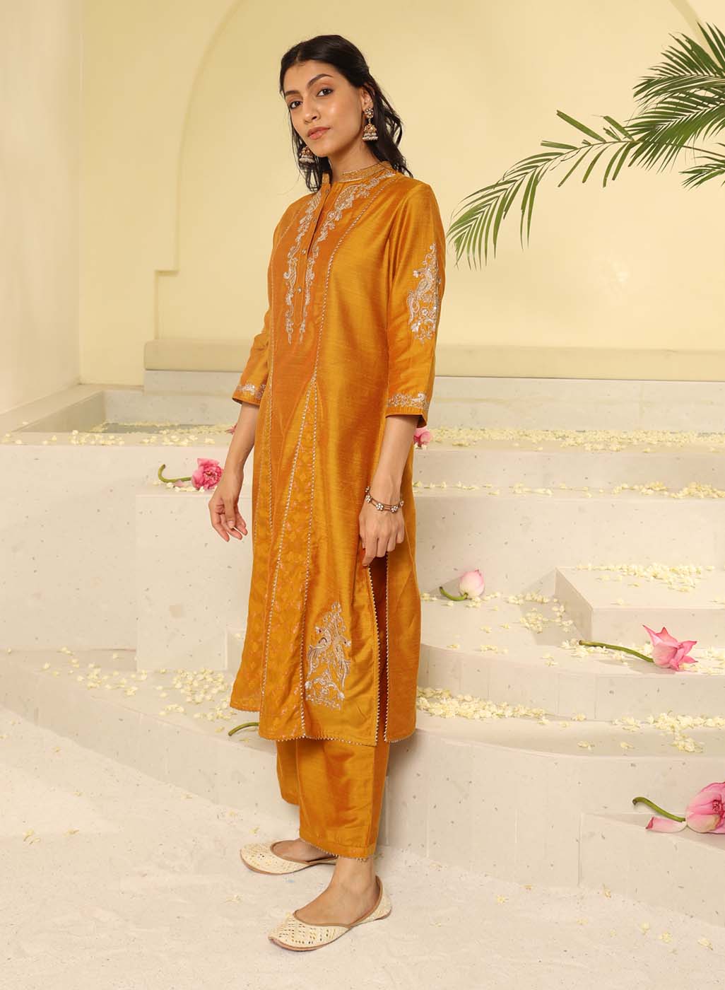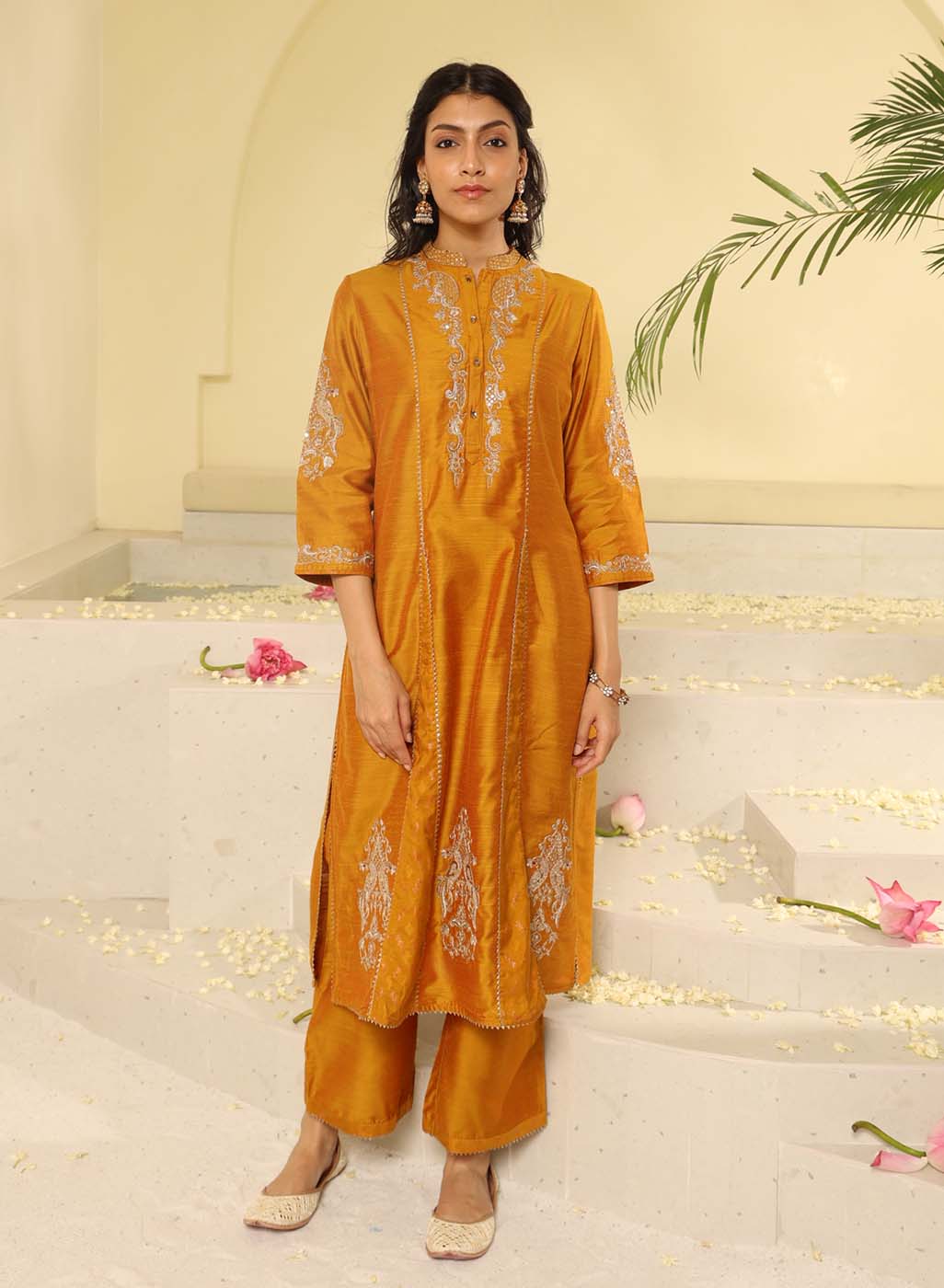 Golden Velvet Kurta Set With Heavy Front Yoke Zari Embroidery