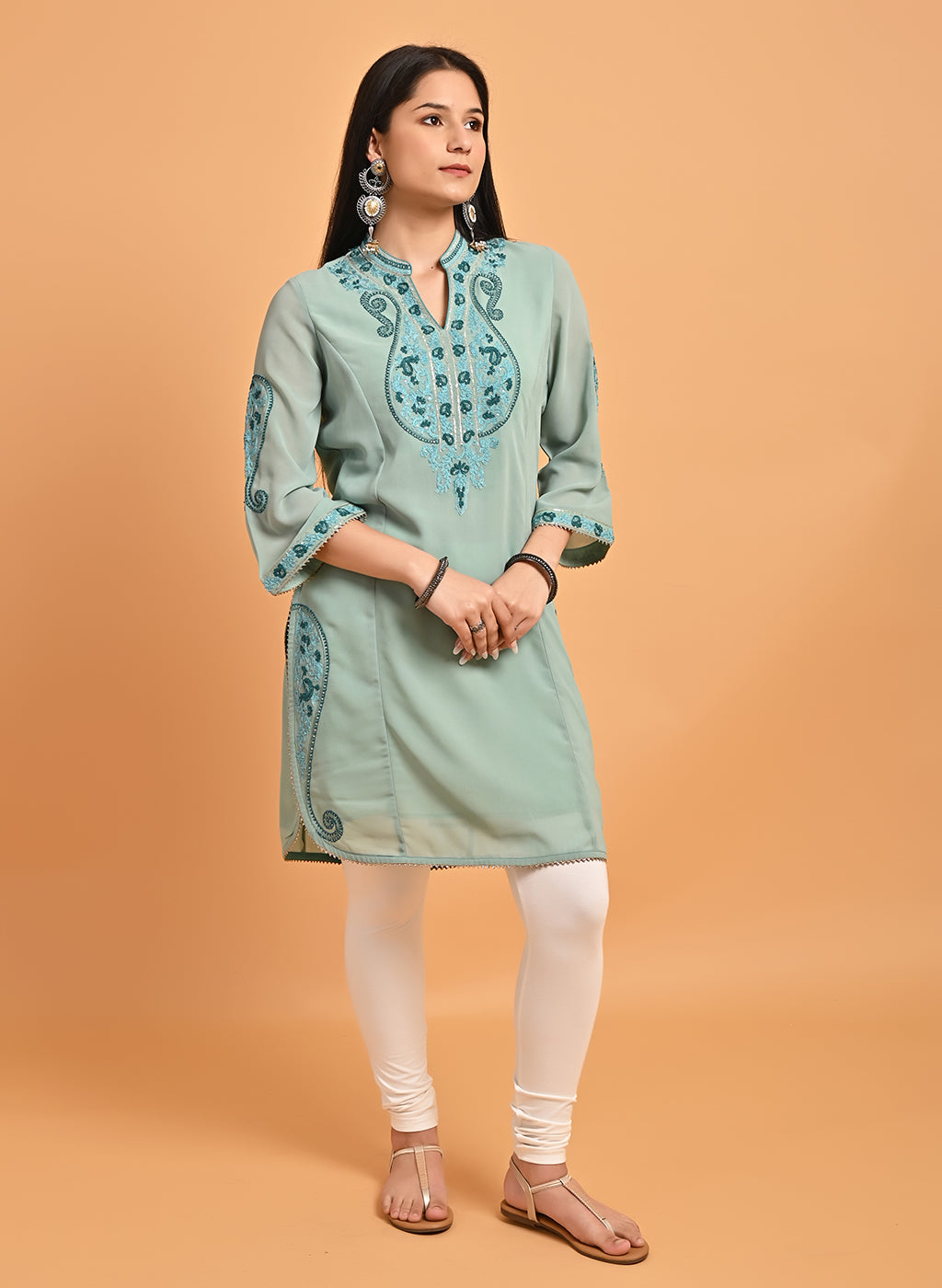 Essex Green Woollen Kurta for Women with Leather Collar and Sequin Work