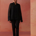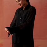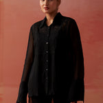 This ruby Black evening shirt, made from lightweight sheer organza, features delicate monochrome thread embroidery along the collar neckline.