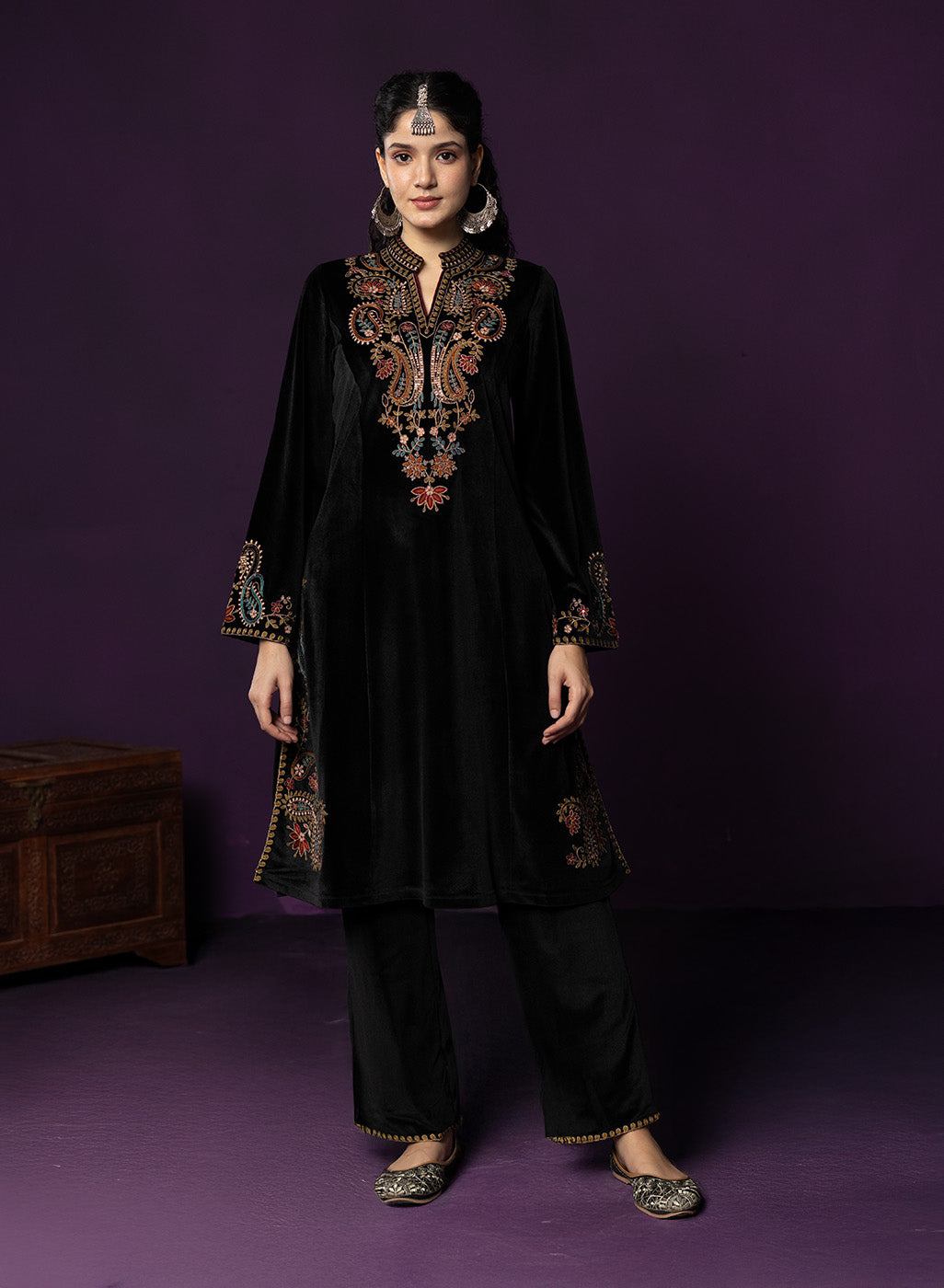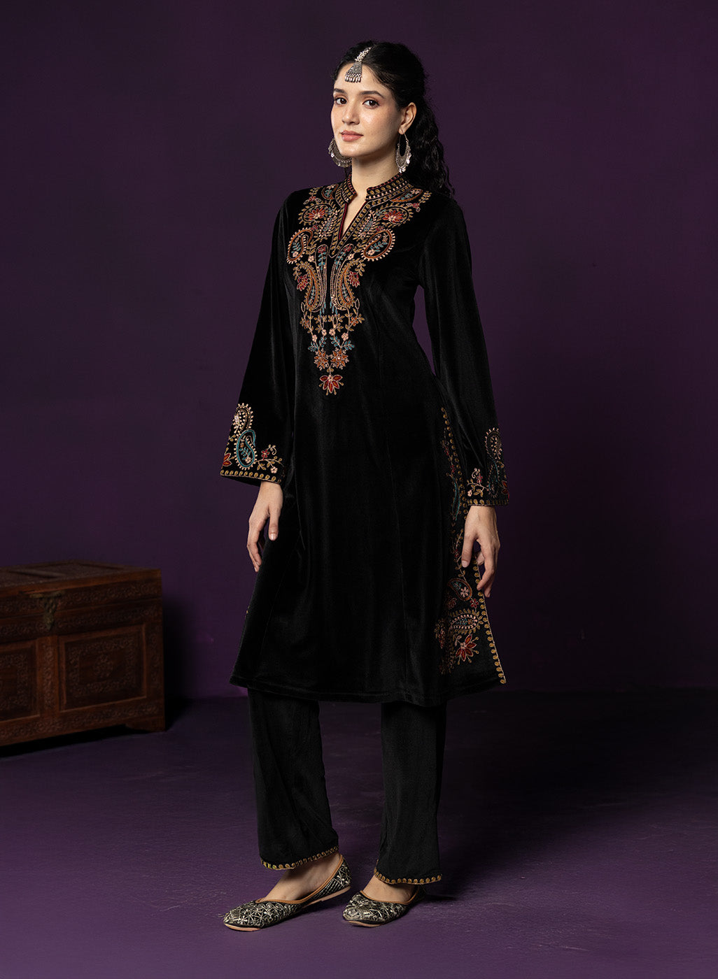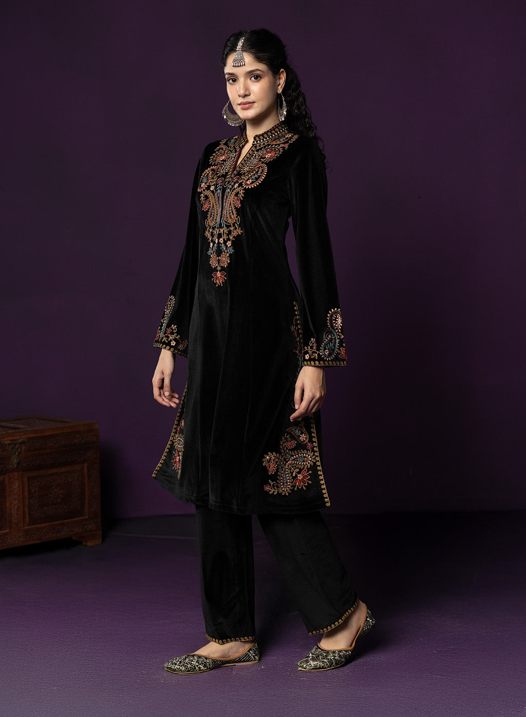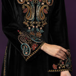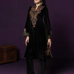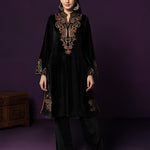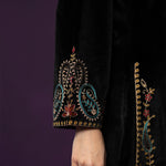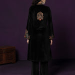 Classic black meets intricate craftsmanship in this velvet co-ord set that feels equal parts timeless and striking. The rich velvet base lends a soft, luxurious sheen, while detailed thread embroidery across the neckline, yoke, front and hem adds depth and texture. Finished with a mandarin collar and graceful bell sleeves, this set is designed for evenings that call for understated drama and refined elegance.