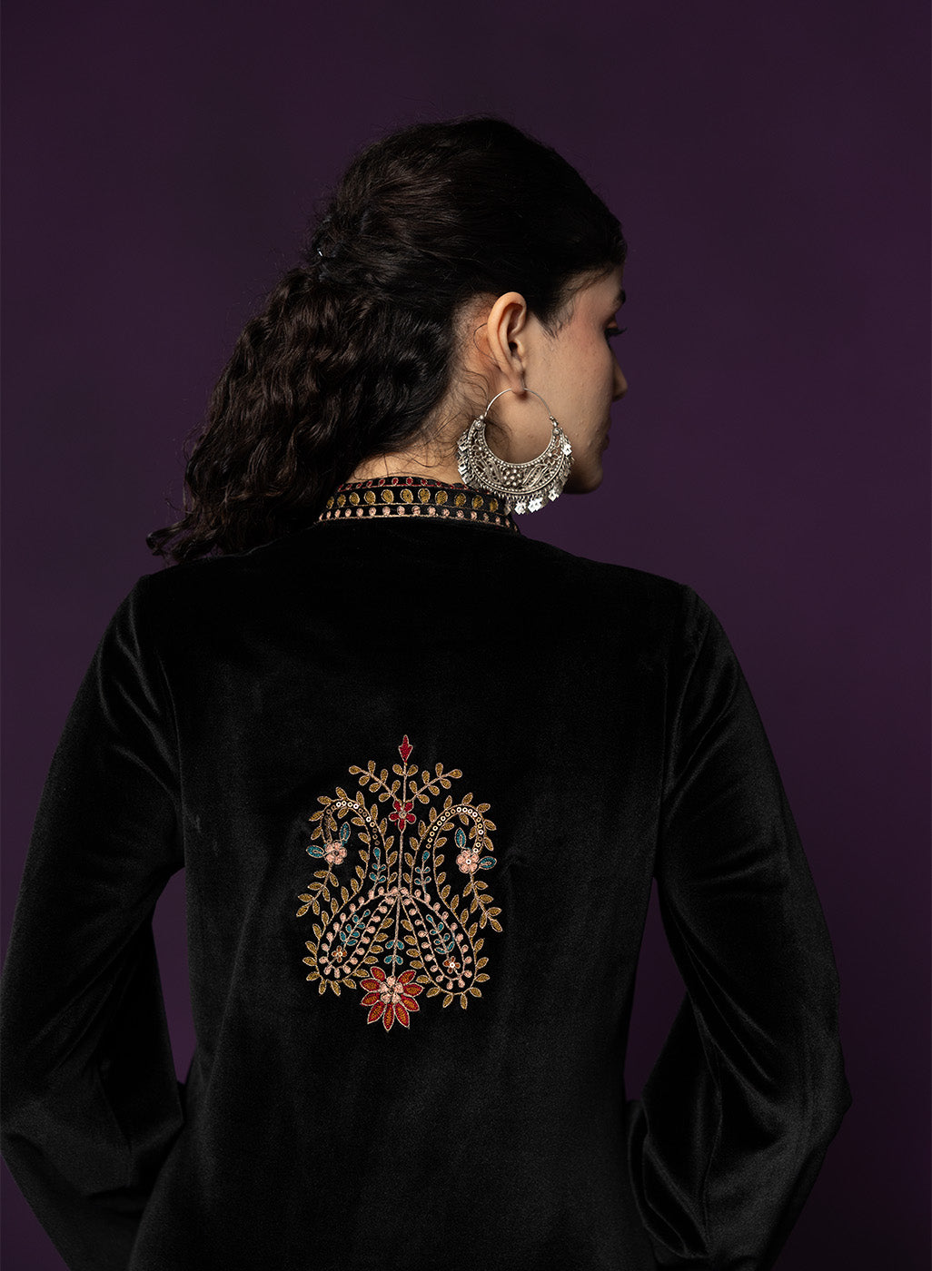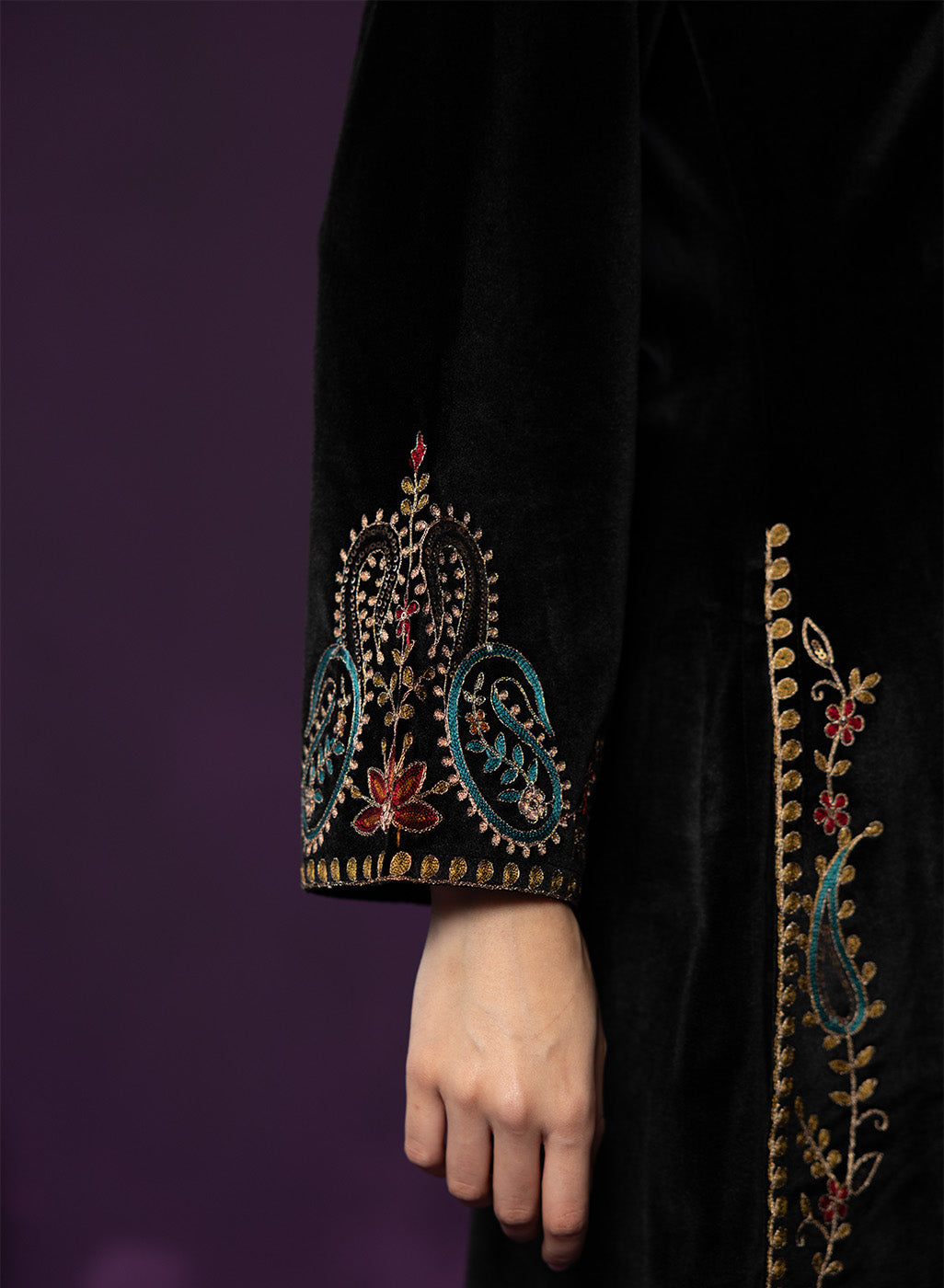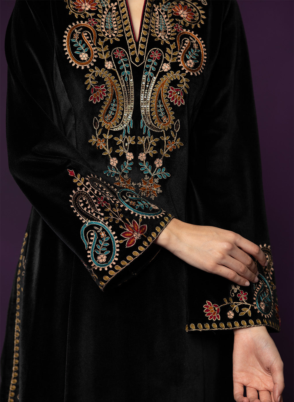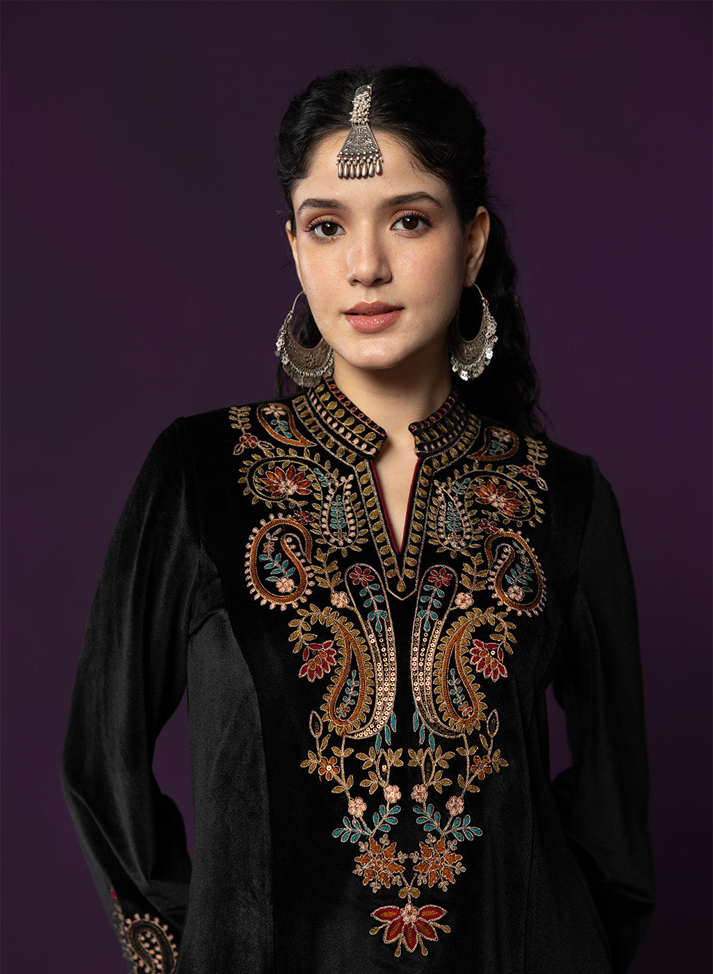 Classic black meets intricate craftsmanship in this velvet co-ord set that feels equal parts timeless and striking. The rich velvet base lends a soft, luxurious sheen, while detailed thread embroidery across the neckline, yoke, front and hem adds depth and texture. Finished with a mandarin collar and graceful bell sleeves, this set is designed for evenings that call for understated drama and refined elegance.