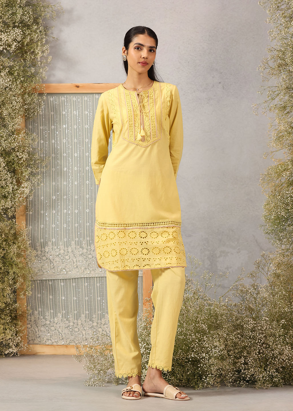 Solid Yellow Textured Kurta Set with Schiffli & Lace Work