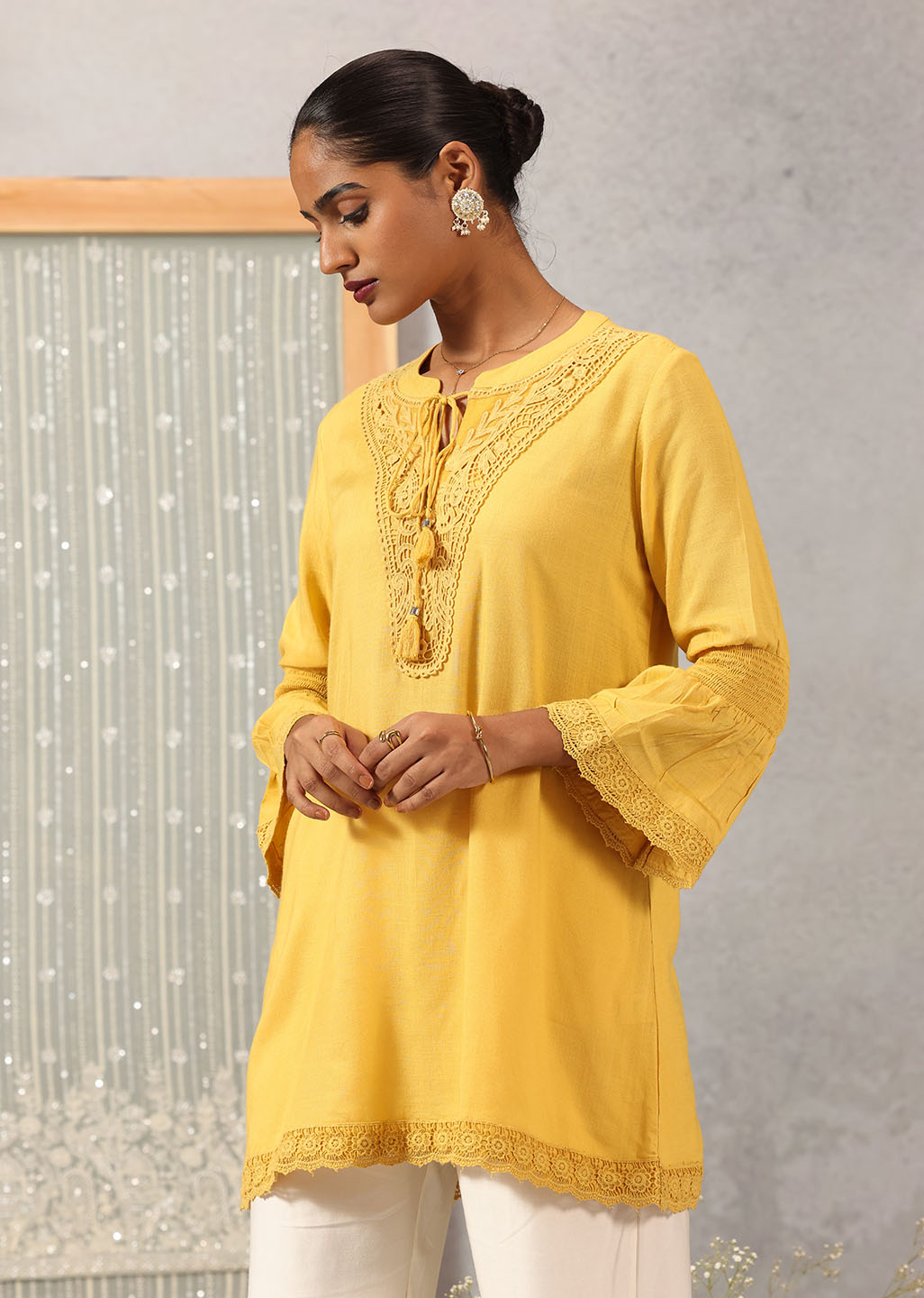 Yellow Solid Tunic with Keyhole Neck and Bell Sleeves