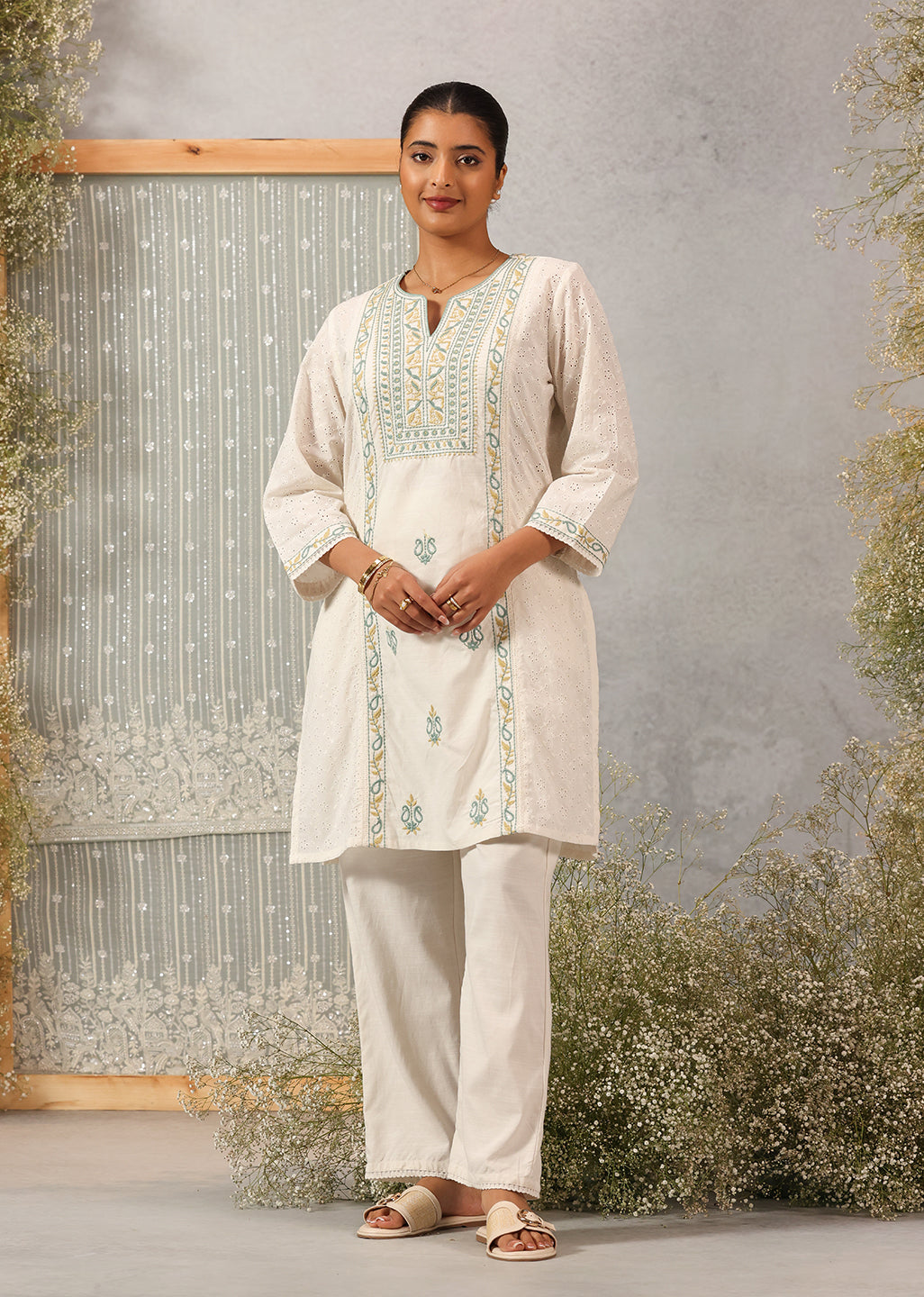 Niya Ivory Embroidered Cotton Linen Slub Long Top for Women