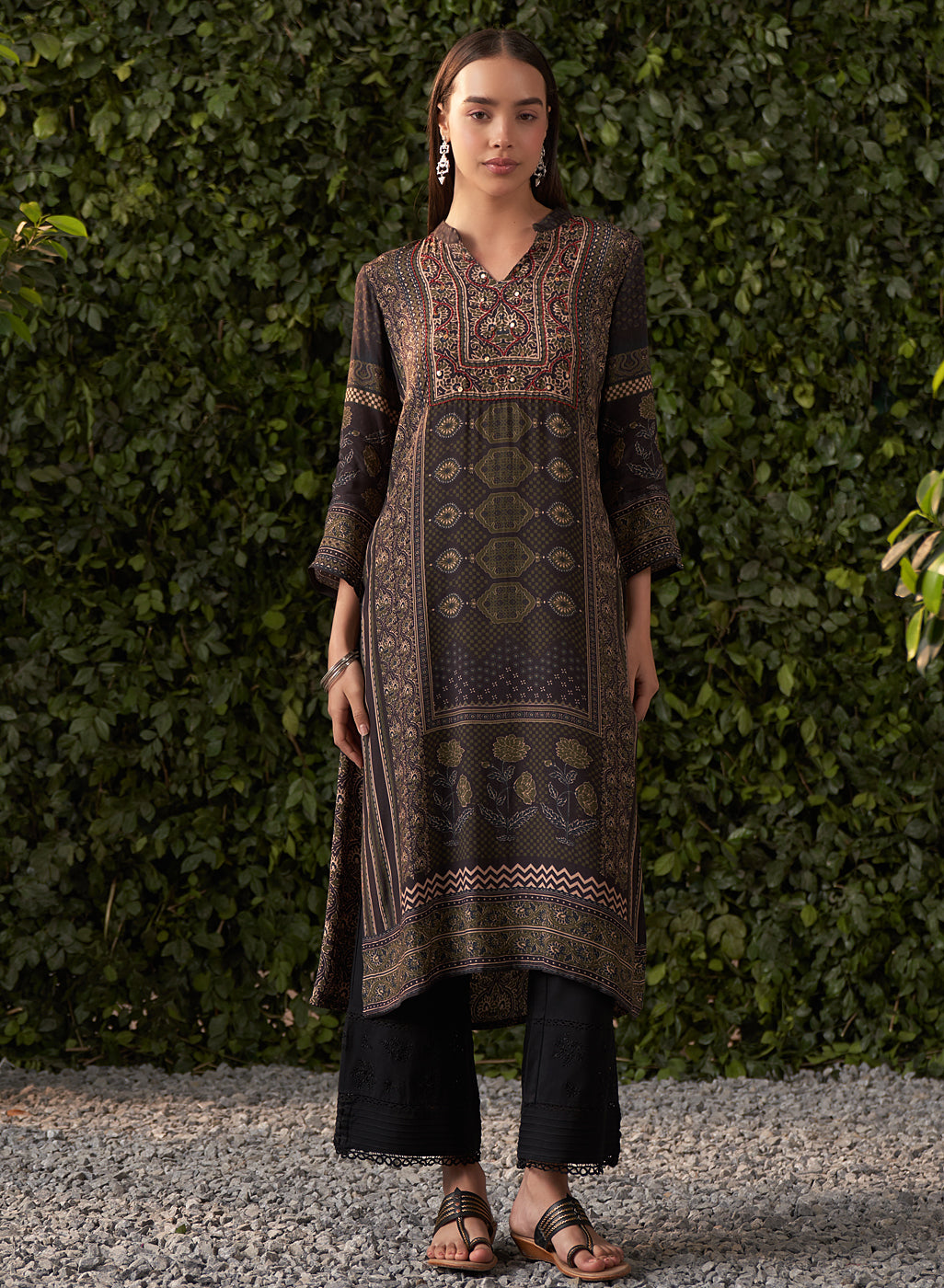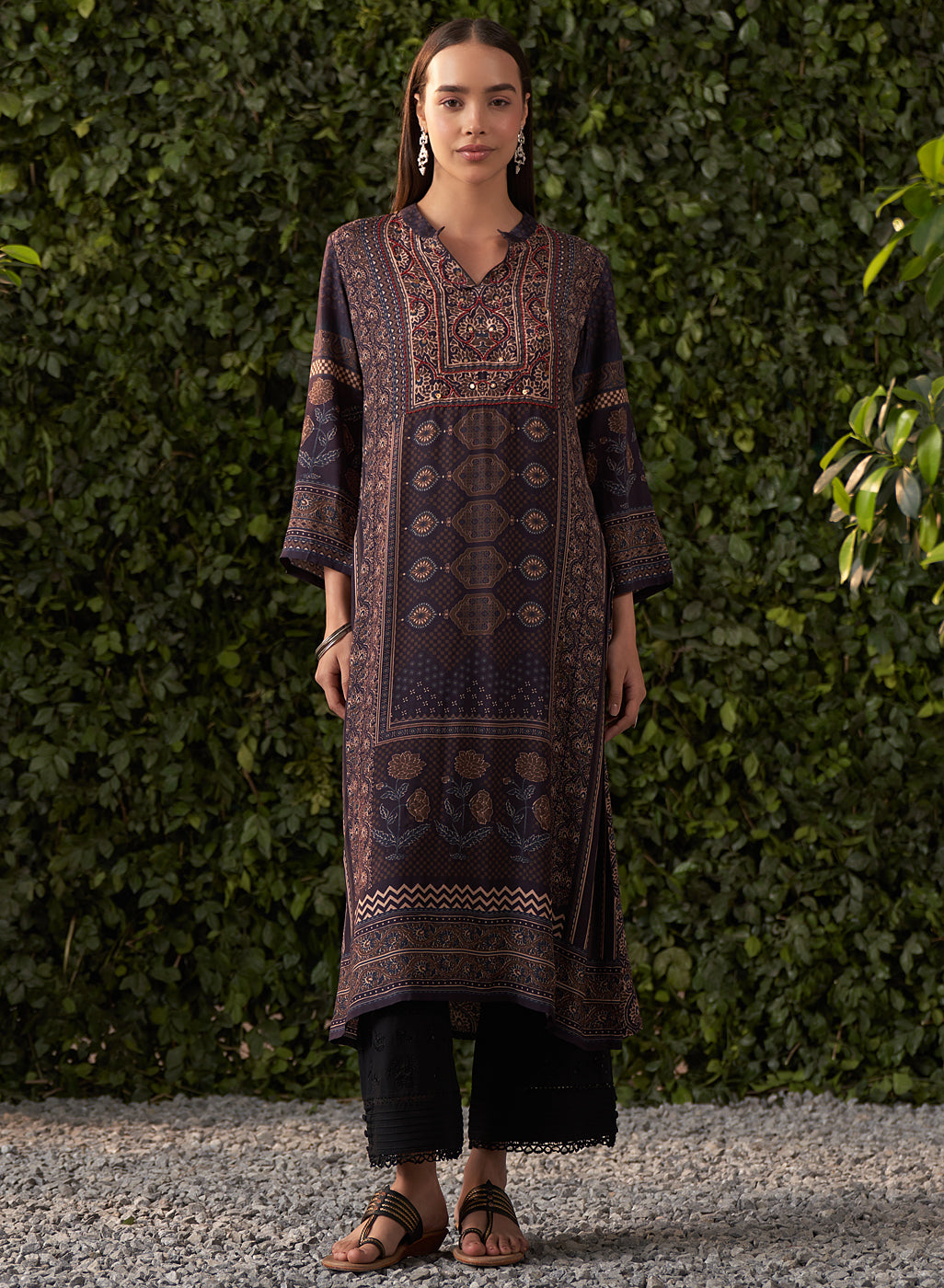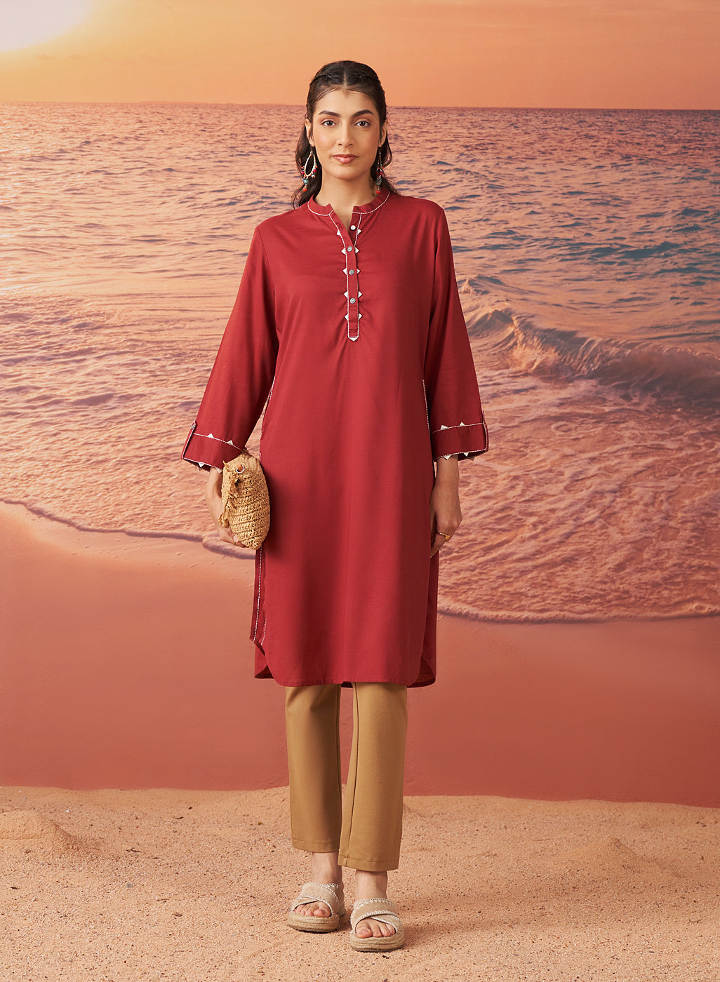 Burgundy Printed Viscose Shantoon Kurta - Long