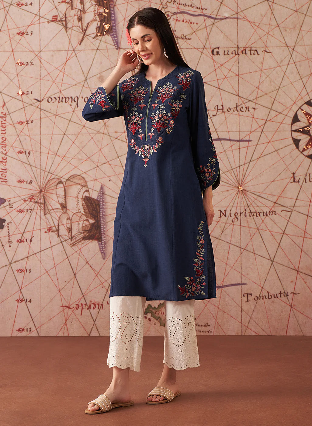 Navy Embroidered Cotton Slub Kurti