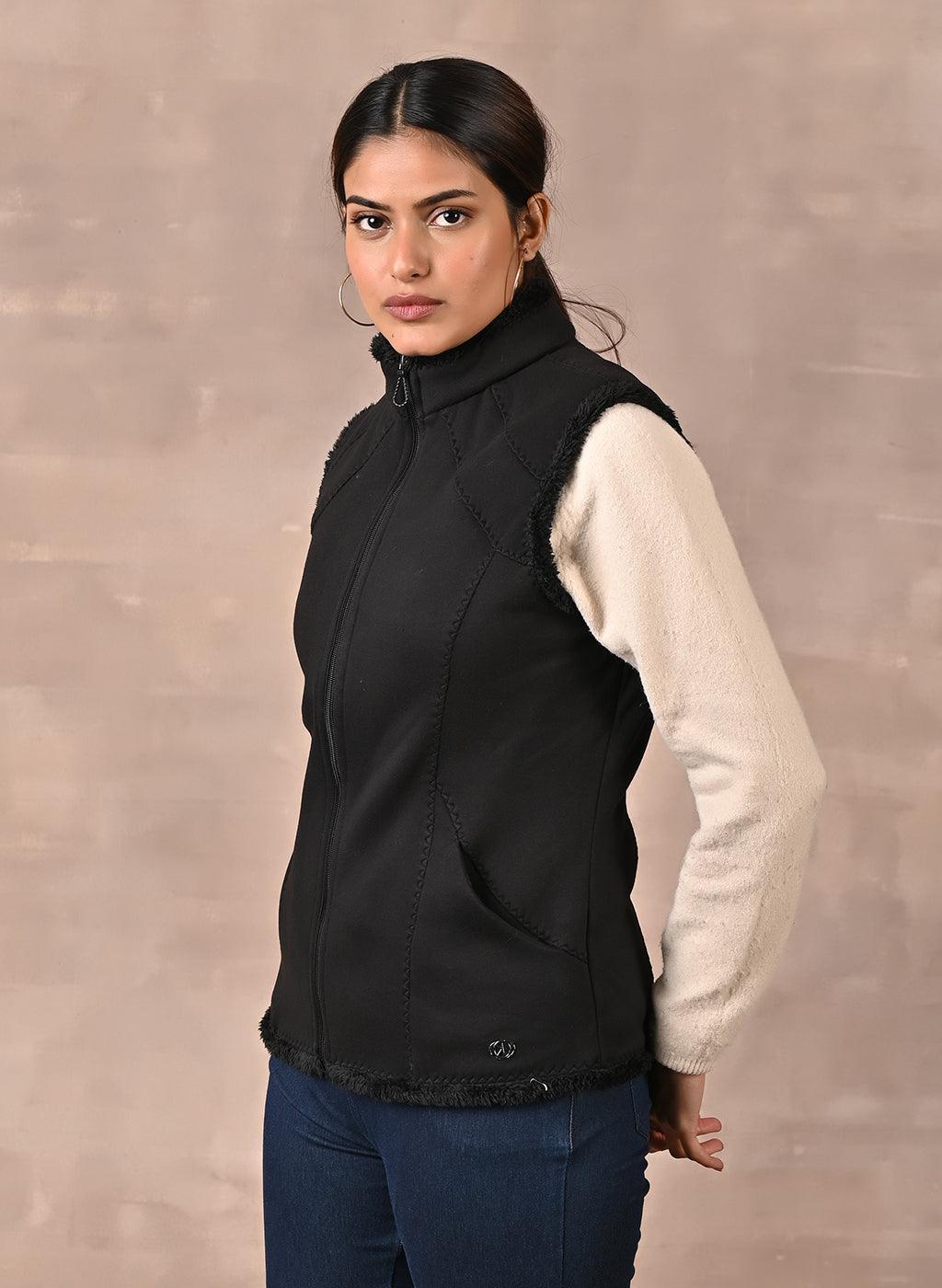 This sleeveless panelled slim-fit jacket comes with fine decorative thread details and a zig-zag decorative stitch. The sherpa fur detail at the hem gives it a sporty yet chic look. Pair it with skinny jeans and boots for that classy and cool vibe.