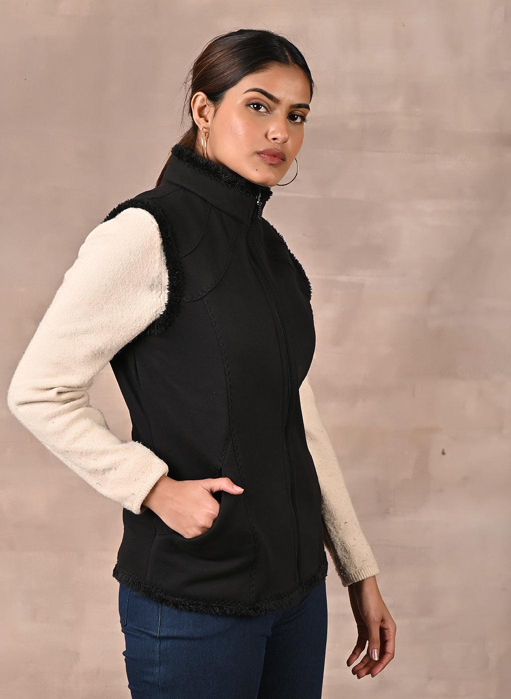 Black Sleeveless Jacket with Fur Detail