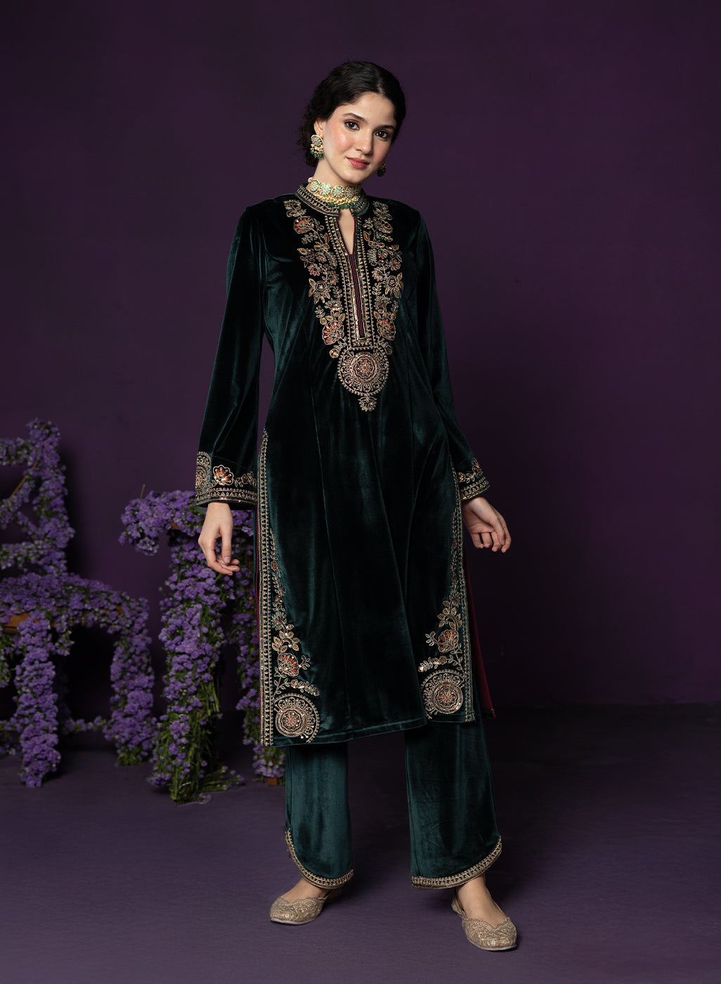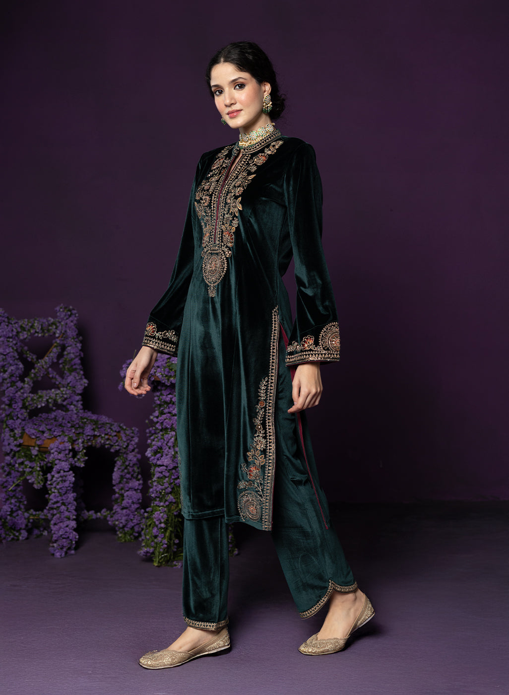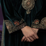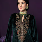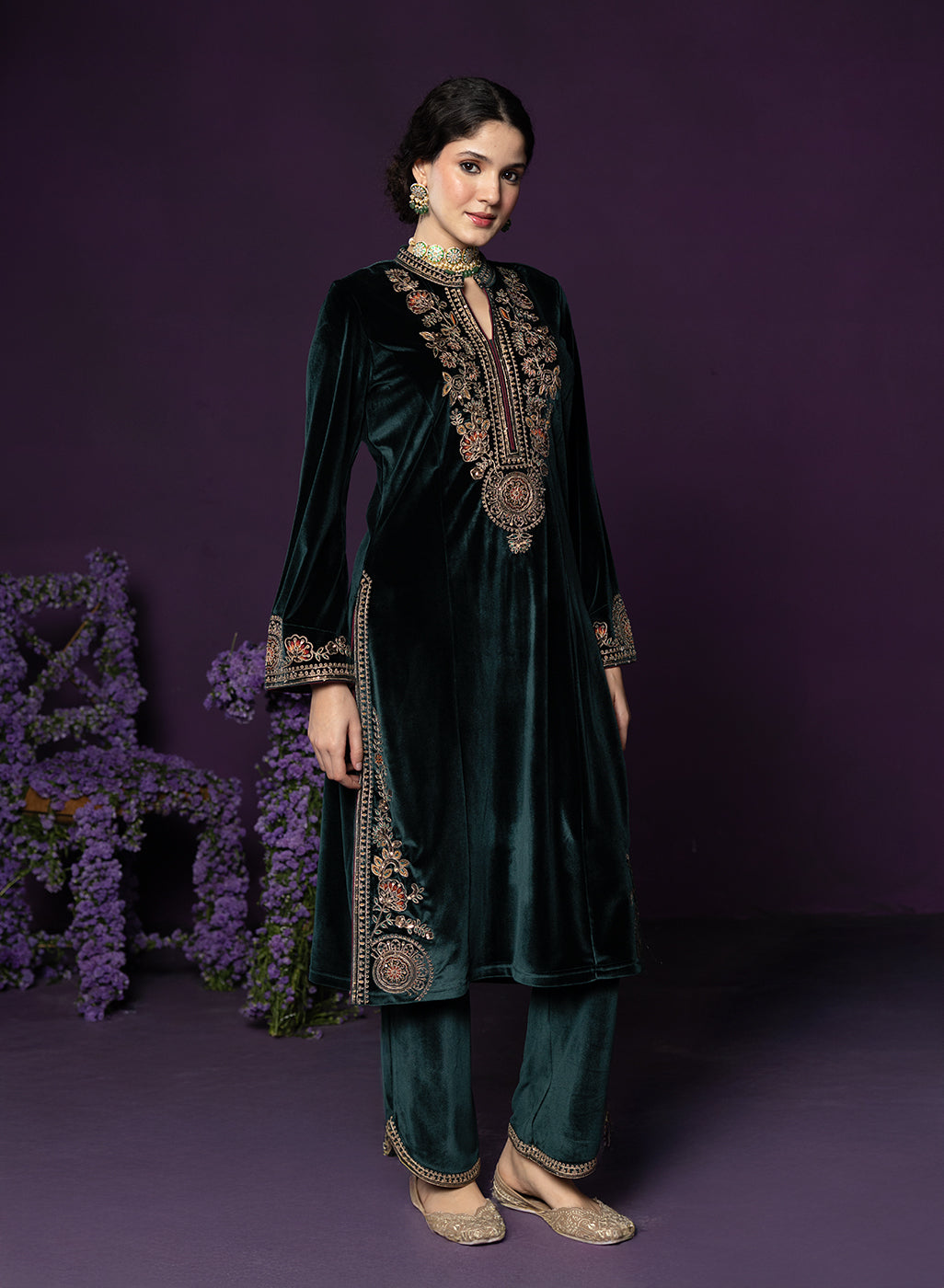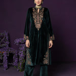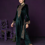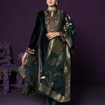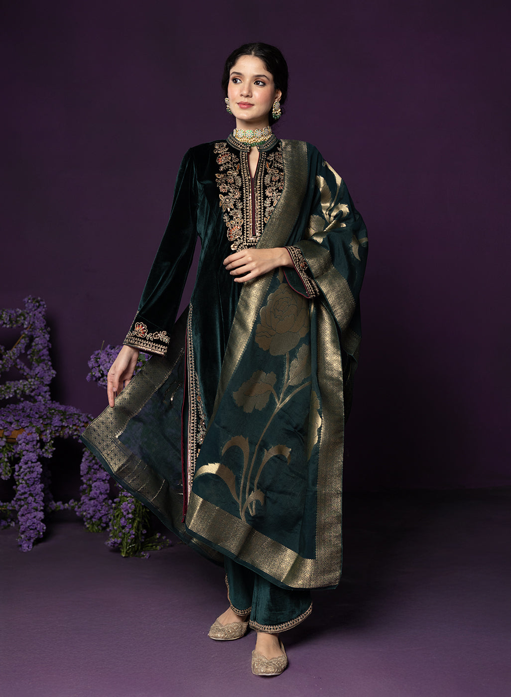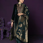 Eshira Emerald Green Embroidered Velvet Suit Set with Banarasi Dupatta