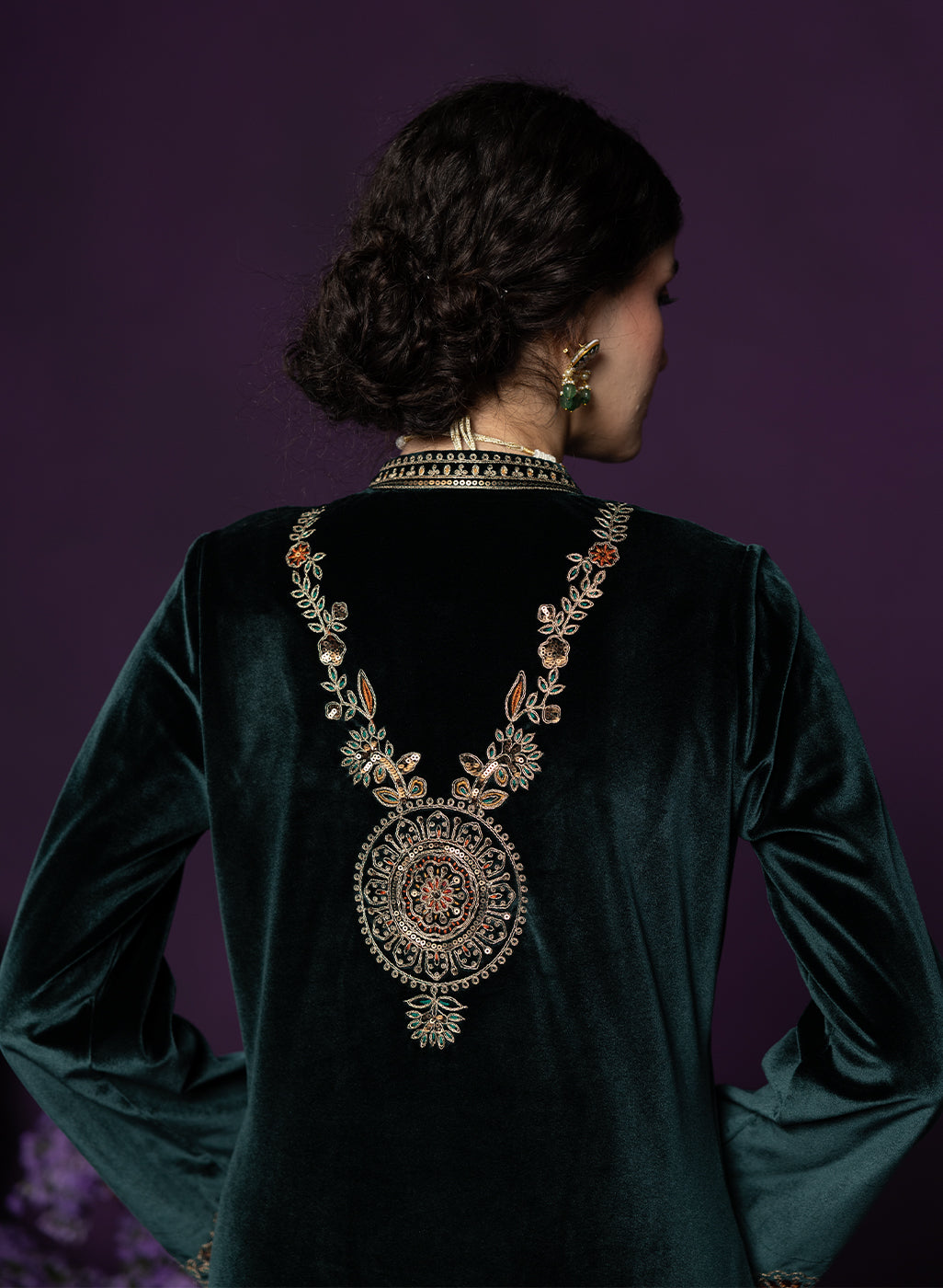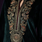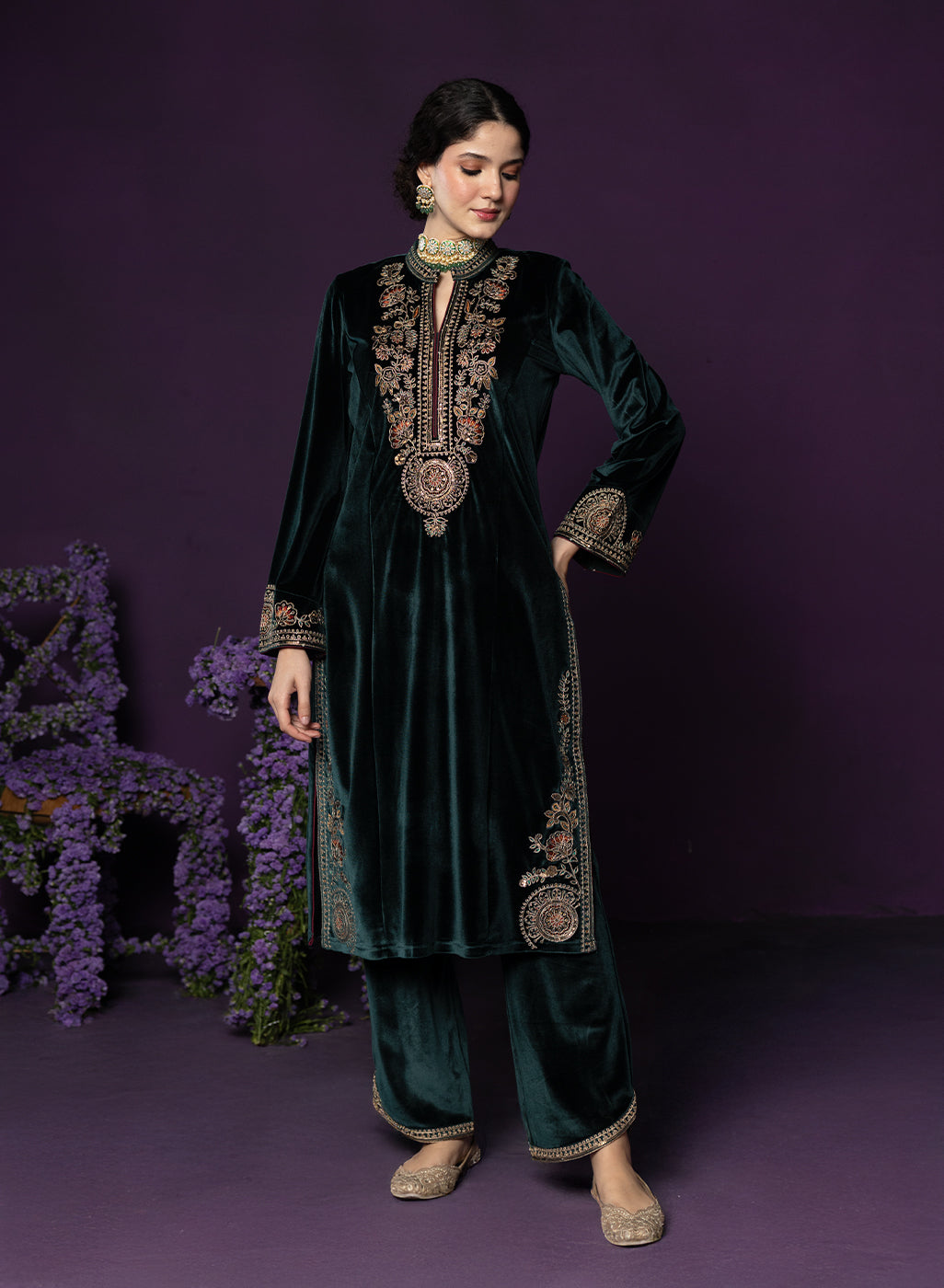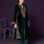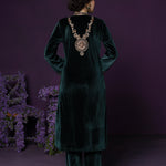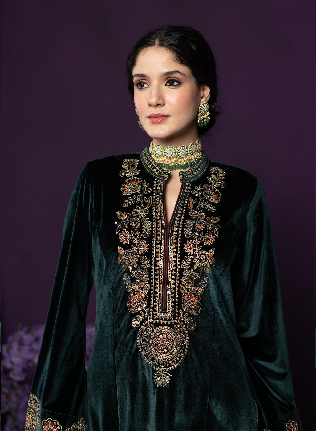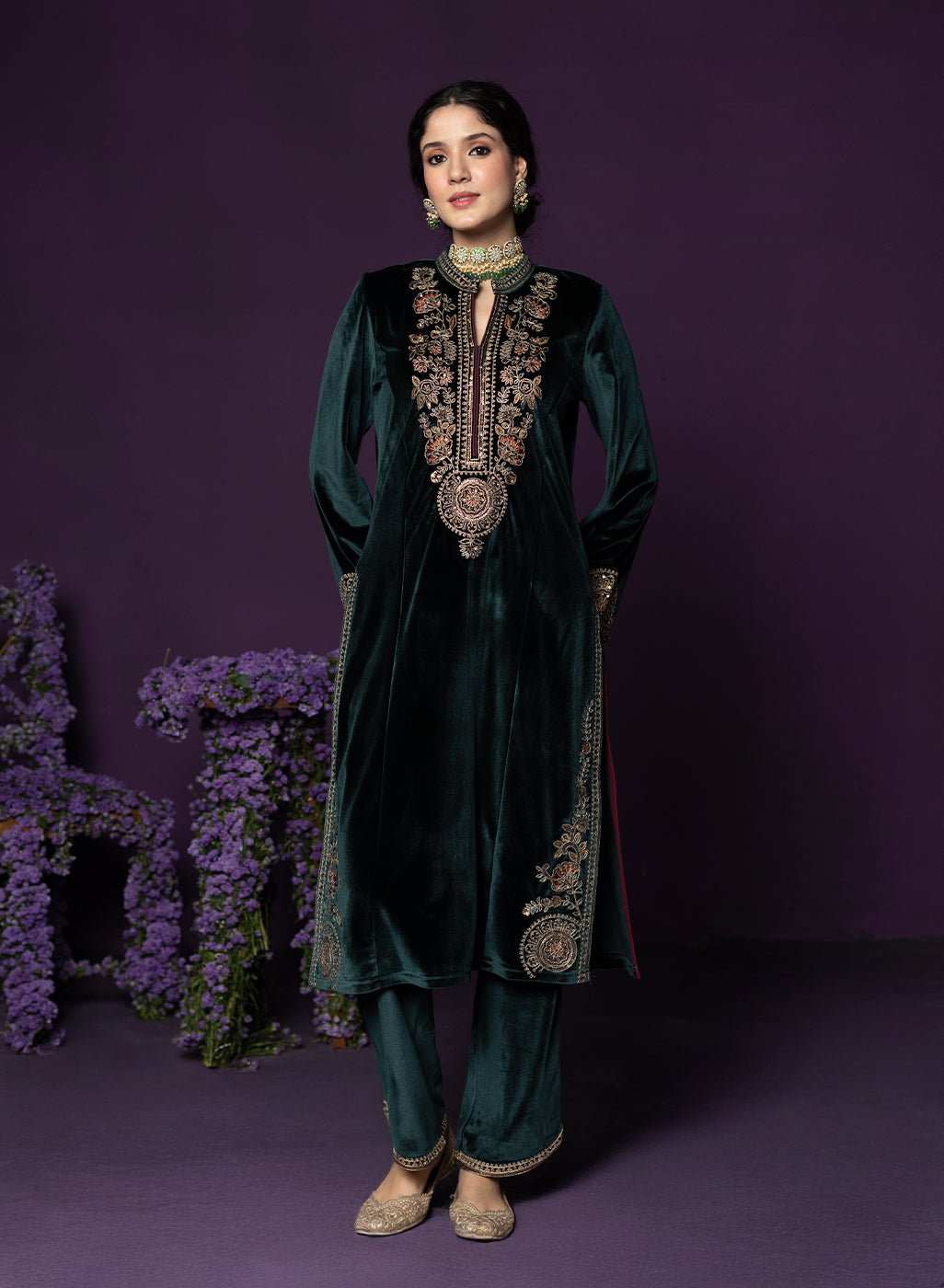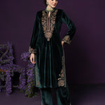 Eshira Emerald Green Embroidered Velvet Suit Set with Banarasi Dupatta